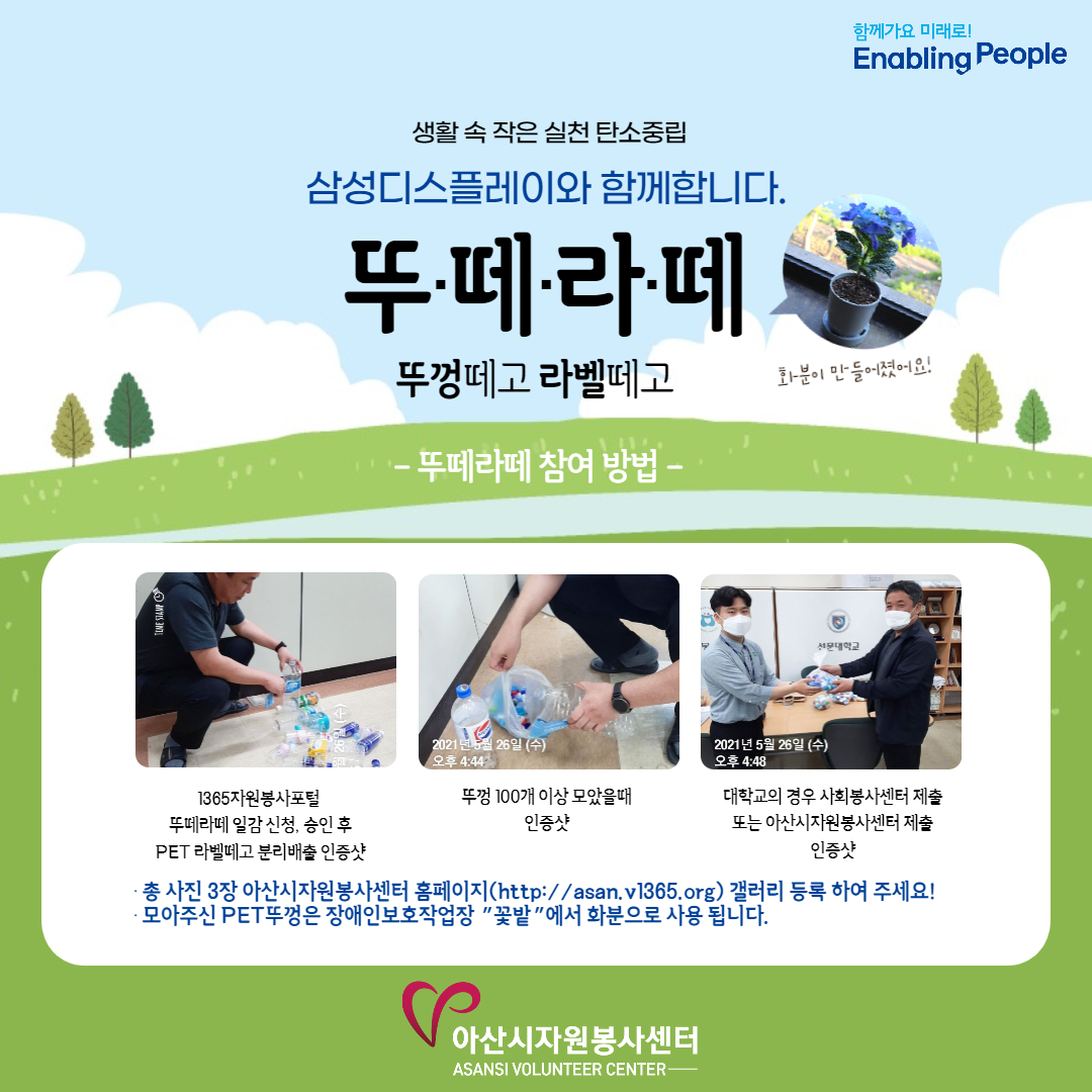 자원봉사자 스토리 [충남 아산시] 삼성디스플레이와 함께하는 탄소 중립 뚜떼라떼 캠페인 관리자 2021.12.29 1413 이전글 [충남 아산시] 안녕! 일상 속 작은 실천 클린아산DAY 함께 할게! 목록 다음글 [충남 아산시] 삼성디스플레이와 함께하는 탄소 중립 뚜떼라떼 캠페인