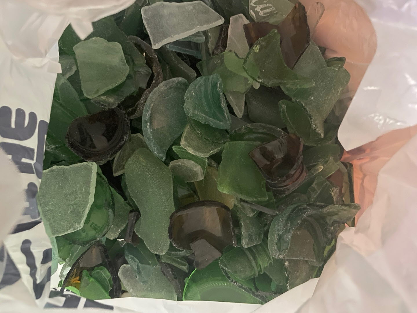 해안가에 쌓여있는 쓰레기들을 수거하고 바다에서 주운 유리조각들로