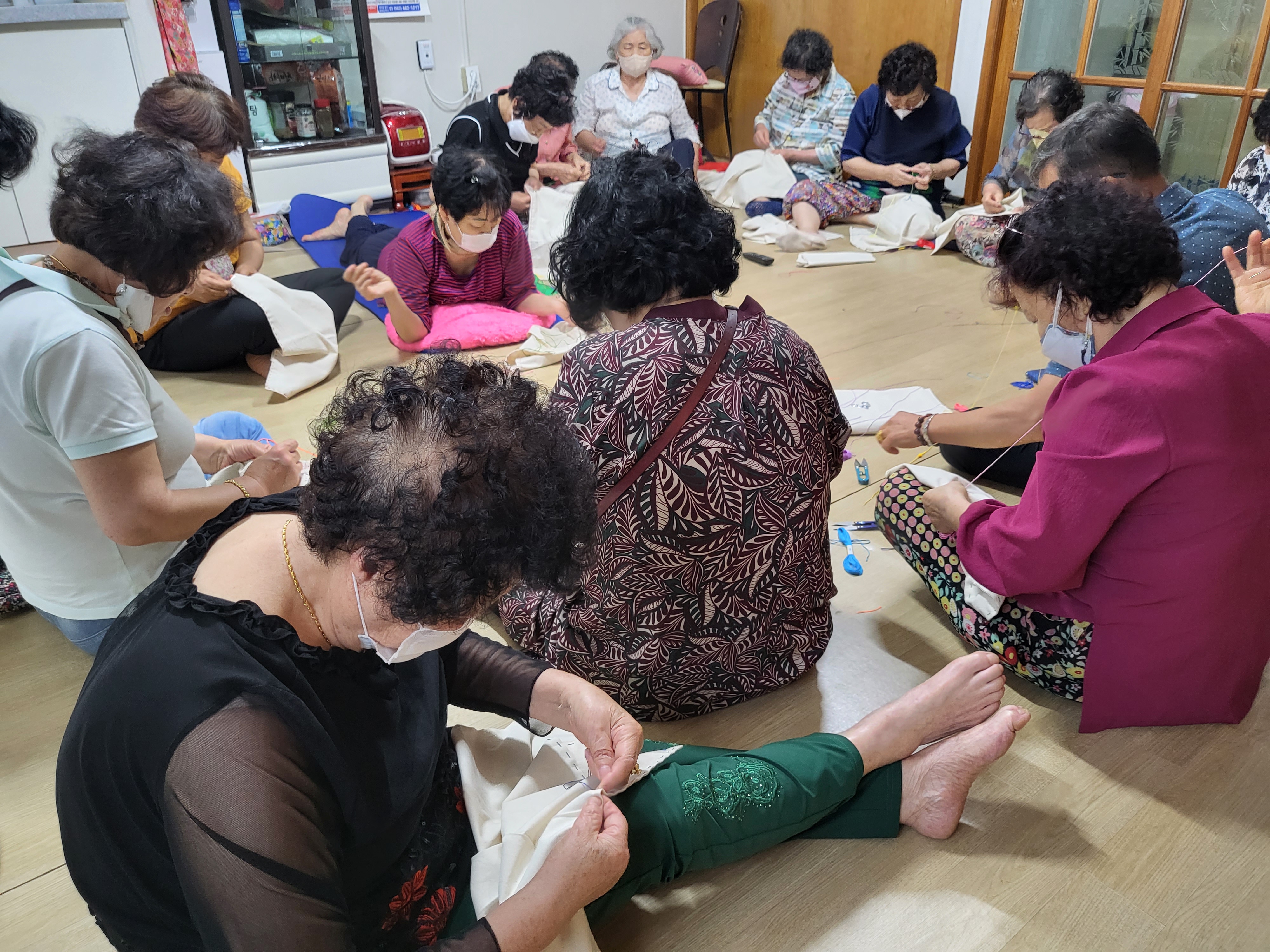 준비한 원단에 어르신들과 함께 손바느질로 수를 놓아