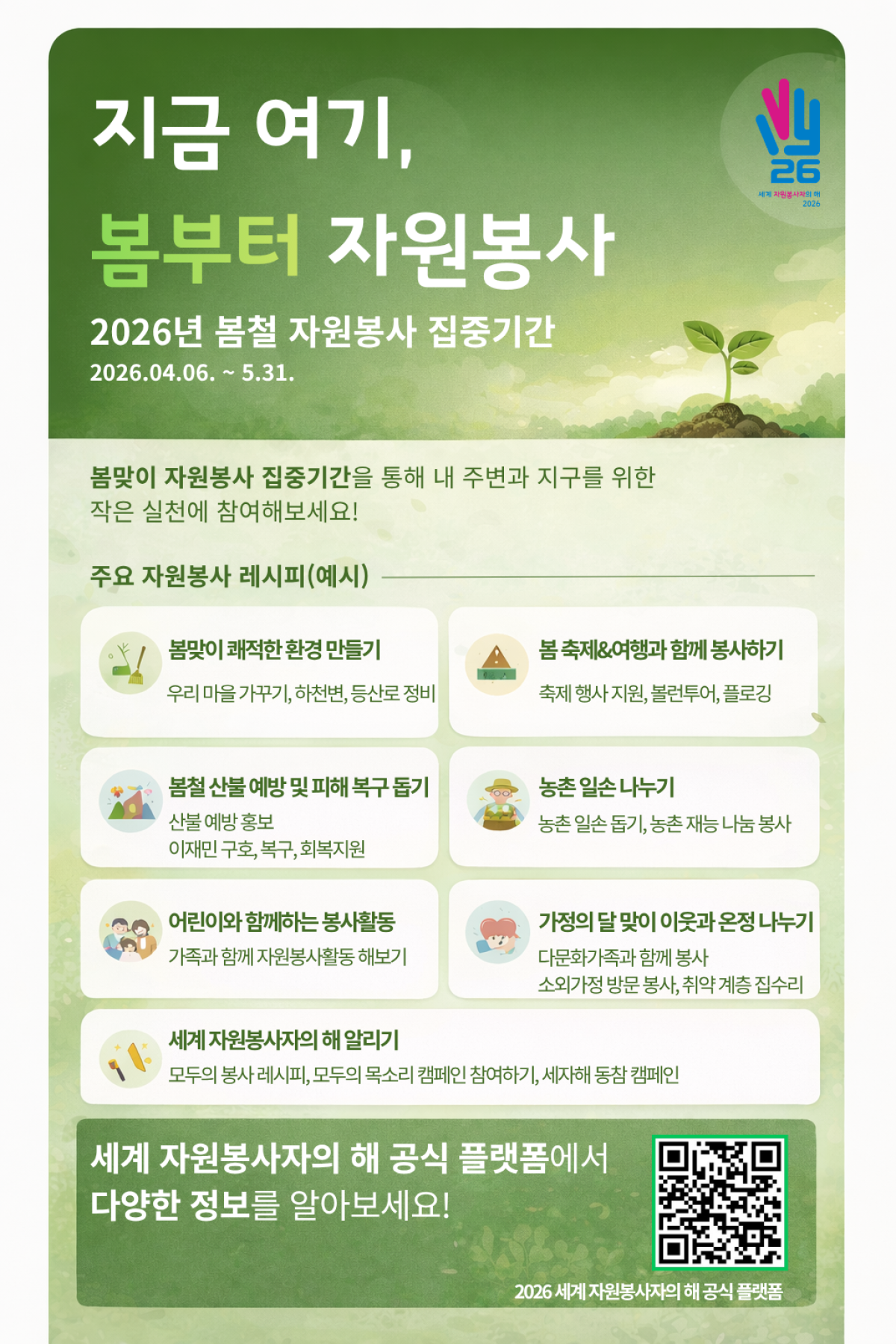 2026년은 UN이 지정한 '세계 자원봉사자의 해(IYV 2026)'입니다. 한국중앙자원봉사센터는 이 뜻깊은 해를 맞아, 봄철 자원봉사 집중기간을 운영합니다. 내 주변의 작은 실천에서 시작해 지역사회와 지구를 함께 가꾸는 시간이 되길 바랍니다.