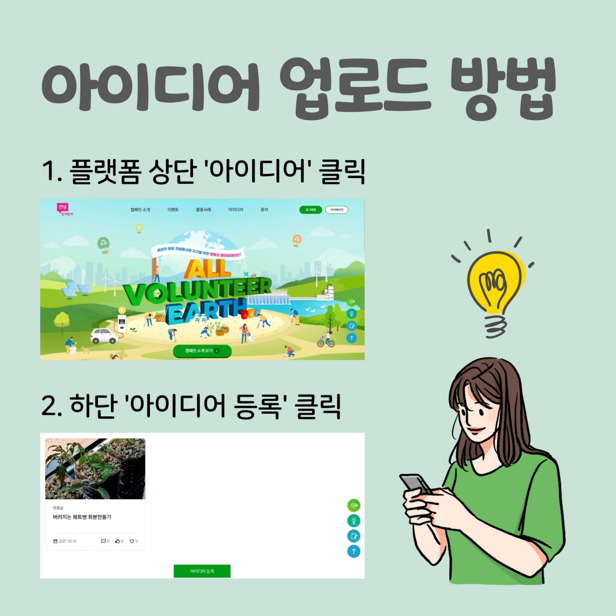 아이디어) 나만의 환경 지키는 방법 뽐내기 공모전, 일주일에 하루라도 채식하기, 버려진 페트병으로 꾸미는 화단 자랑,