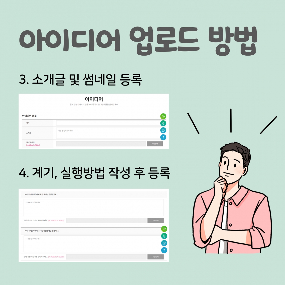 플랫폼에 많은 사례와 아이디어가 모이고, 많은 기업과 기관들이 참여하여 세상이 변화하는 계기가 되었으면 좋겠다는 마음에 부족하나마 준비해보았습니다 :) 많은 아이디어를 제안주셨는데요, 혹시 괜찮으시다면 해당 아이디어들을 아이디어 카테고리 내에 업로드해주실 수 있을까요?