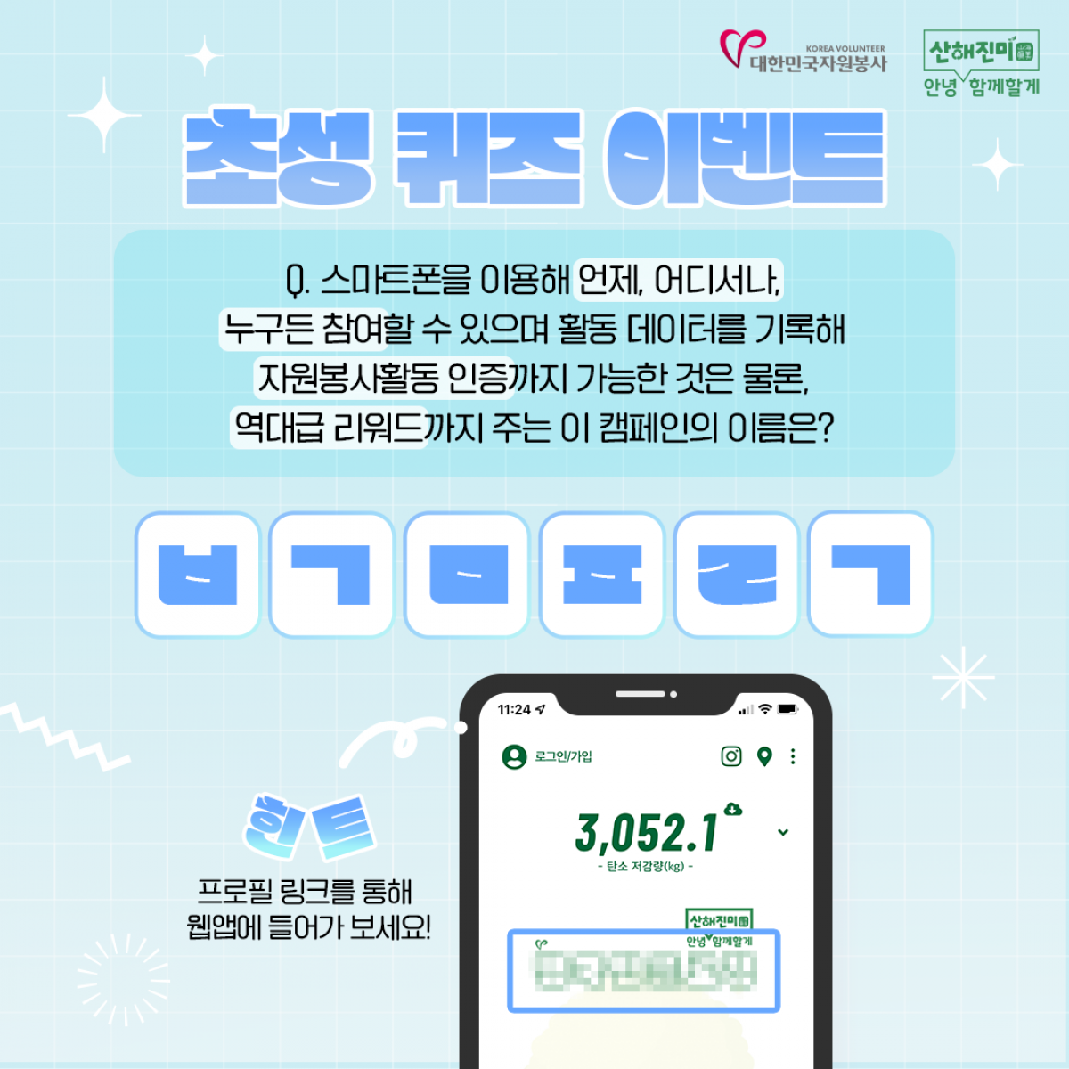 과연 정답은 무엇일까요~? 힌트는 한국중앙자원봉사센터 인스타그램(@kvc1365) 프로필 링크를 통해 데이터플로깅 웹앱에 들어가 보시면 찾을 수 있습니다!
