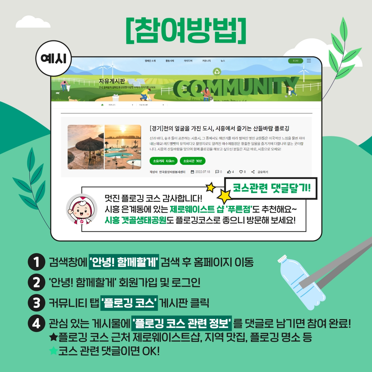 본 이벤트는 안녕 함께할게 홈페이지의 ‘플로깅 코스’ 게시판의 게시물에 코스관련 댓글을 남겨주셔야 참여 완료가 됩니다! 이 점 참고하시어 이벤트 참여를 부탁드립니다 ~