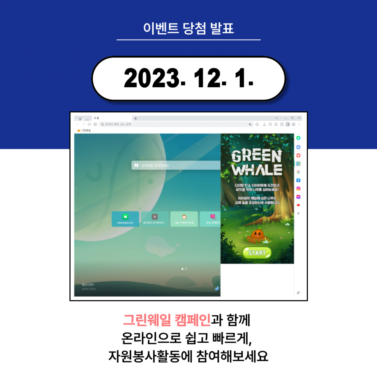 주요행사 [2023] 그린웨일 회원가입 이벤트 2023.10.18 ~ 2023.11.30 한국중앙자원봉사센터 이전글 [2023] 네이버웨일X그린웨일 콜라보 이벤트... 목록 다음글 [2023] 안녕! 산해진미 함께할게 이벤트 : 빈 칸...