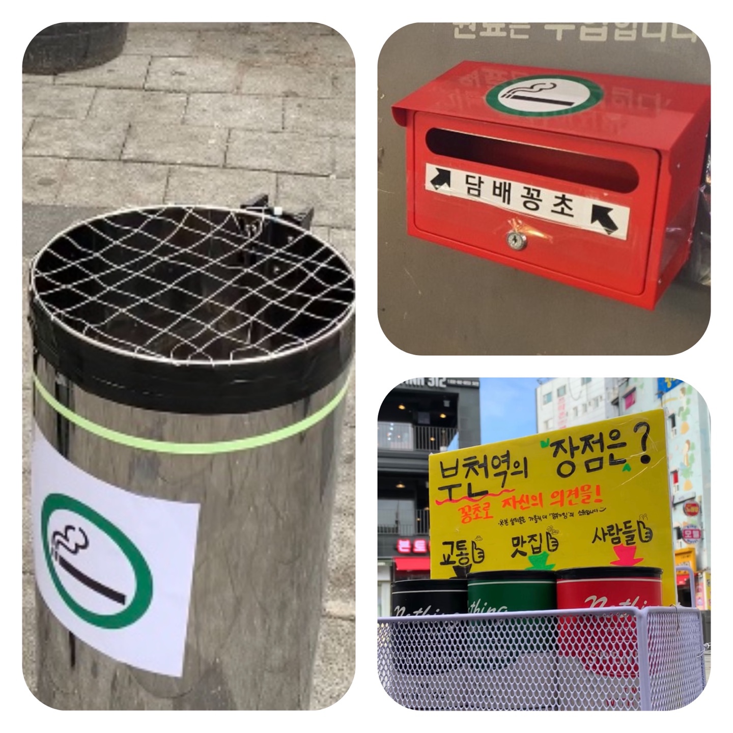 저희는 이 수거함을 '꽁초픽(pick)'이라고 이름 붙였는데요. 사람들의 흥미를 유발하는 데에 중점을 둔 유형의 수거함이었답니다! 우리는 늘 선택의 기로에 서죠. 치킨은 양념 아니면 후라이드? 짜장 아니면 짬뽕? 엄마랑 아빠 중에 누가 더 좋아? 등등 말이에요. 자신의 의견을 재미있게 드러내도록 설문을 적어놓고 각각의 답변마다 작은 깡통을 여러 개 설치해 담배꽁초를 넣어 답을 하는 식입니다. 저희는 심곡동이라는 지역적 특성을 살려, ‘부천역의 장점은?’이라는 질문을 던졌어요.