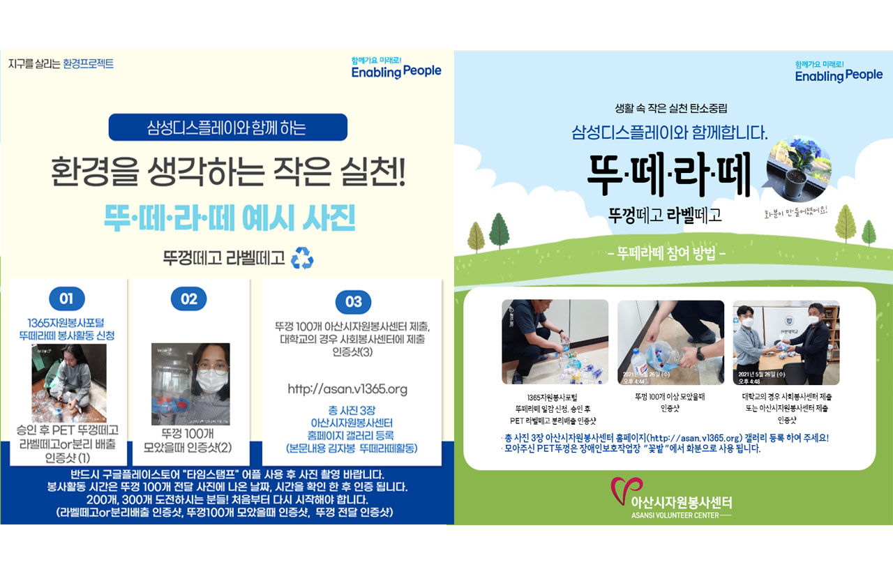 투명 페트병 배출 시 라벨을 꼭 제거하는 올바른 분리배출 방법을 시민들에게 알려주고 싶었습니다. 지자체에도 분리배출 정책 사업이 많이 있고 활발히 진행되고 있었는데 새로운 분리배출 정책에 대한 교육적인 차원과 함께 이를 자원봉사와 접목하고 싶었습니다. 평소에도 네트워크가 잘 되어있던 삼성디스플레이 사회공헌단 쪽에서도 제안이 와 함께 캠페인을 진행하게 되었습니다.