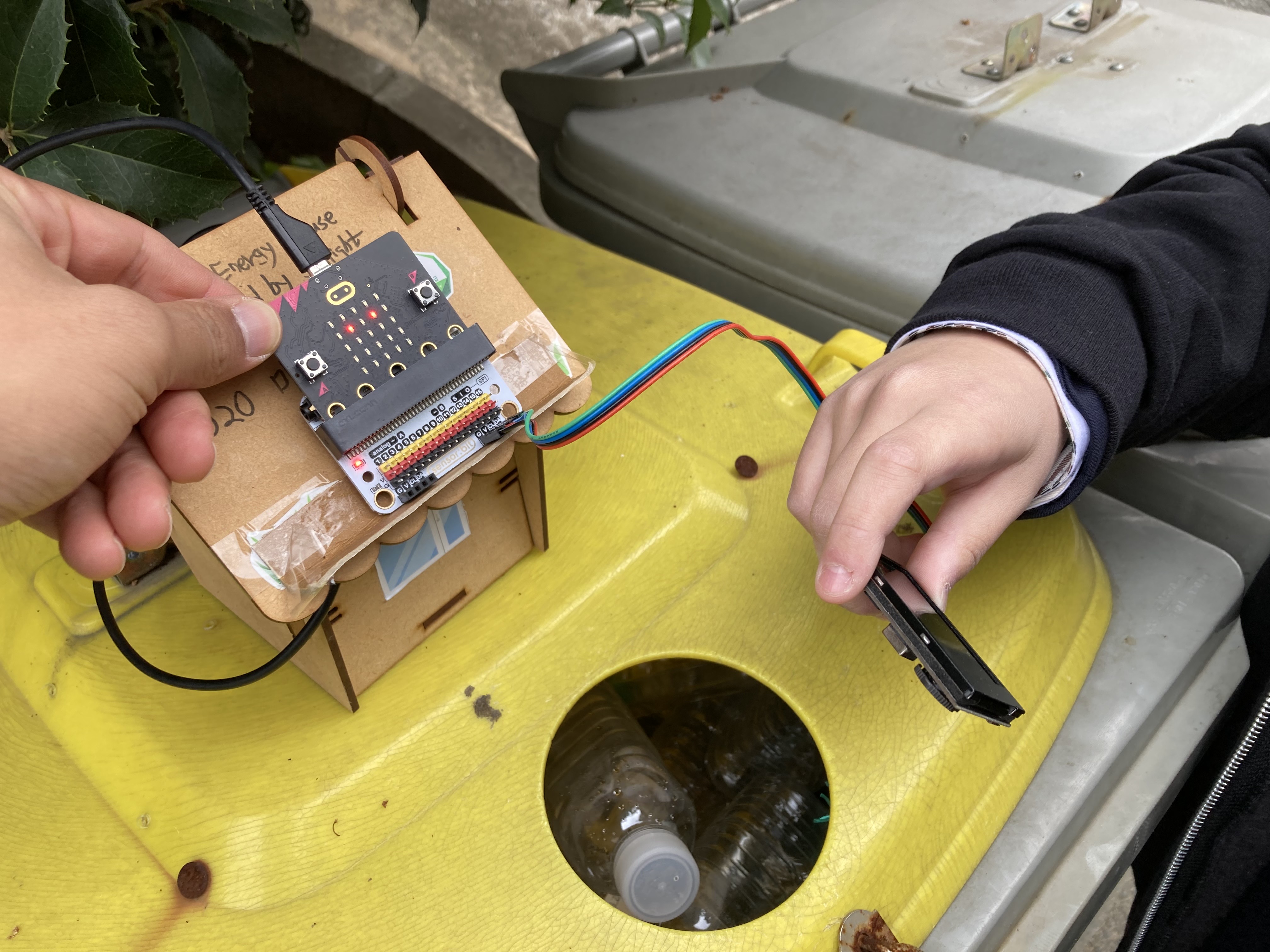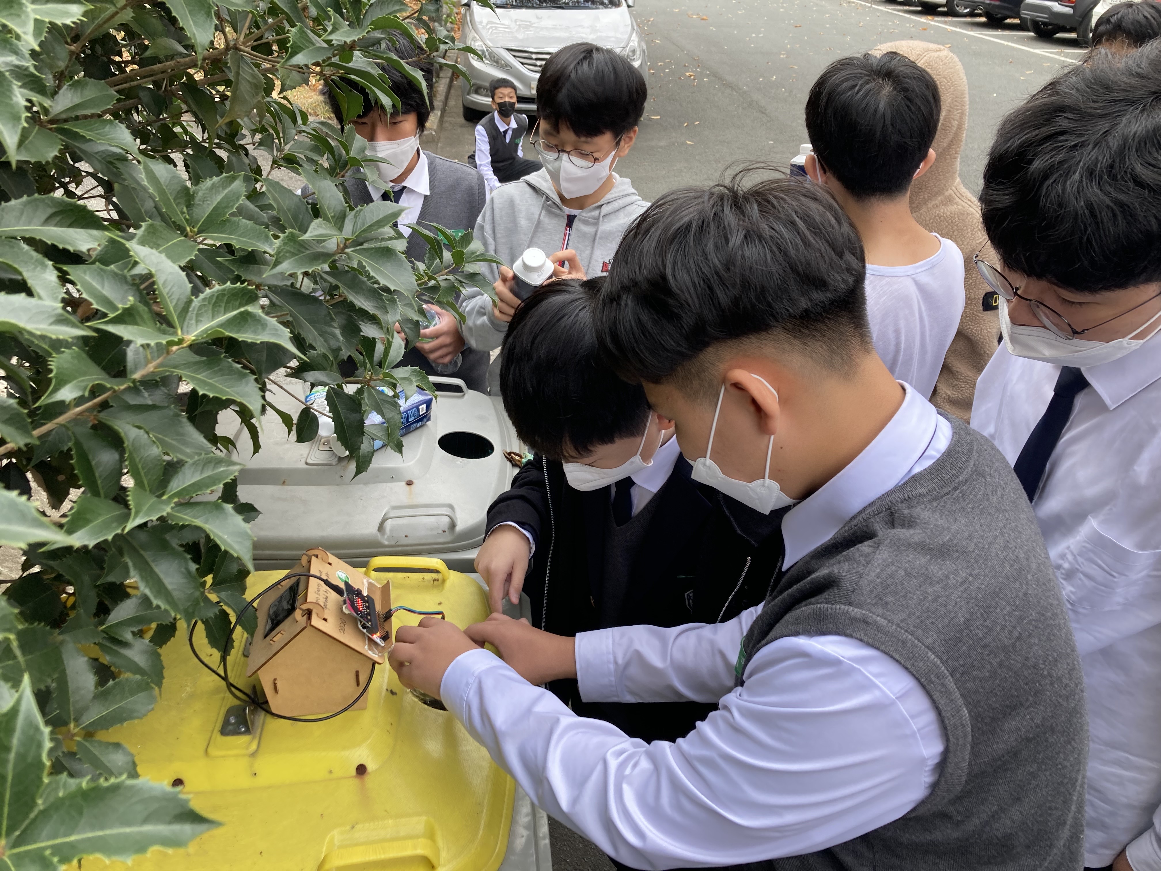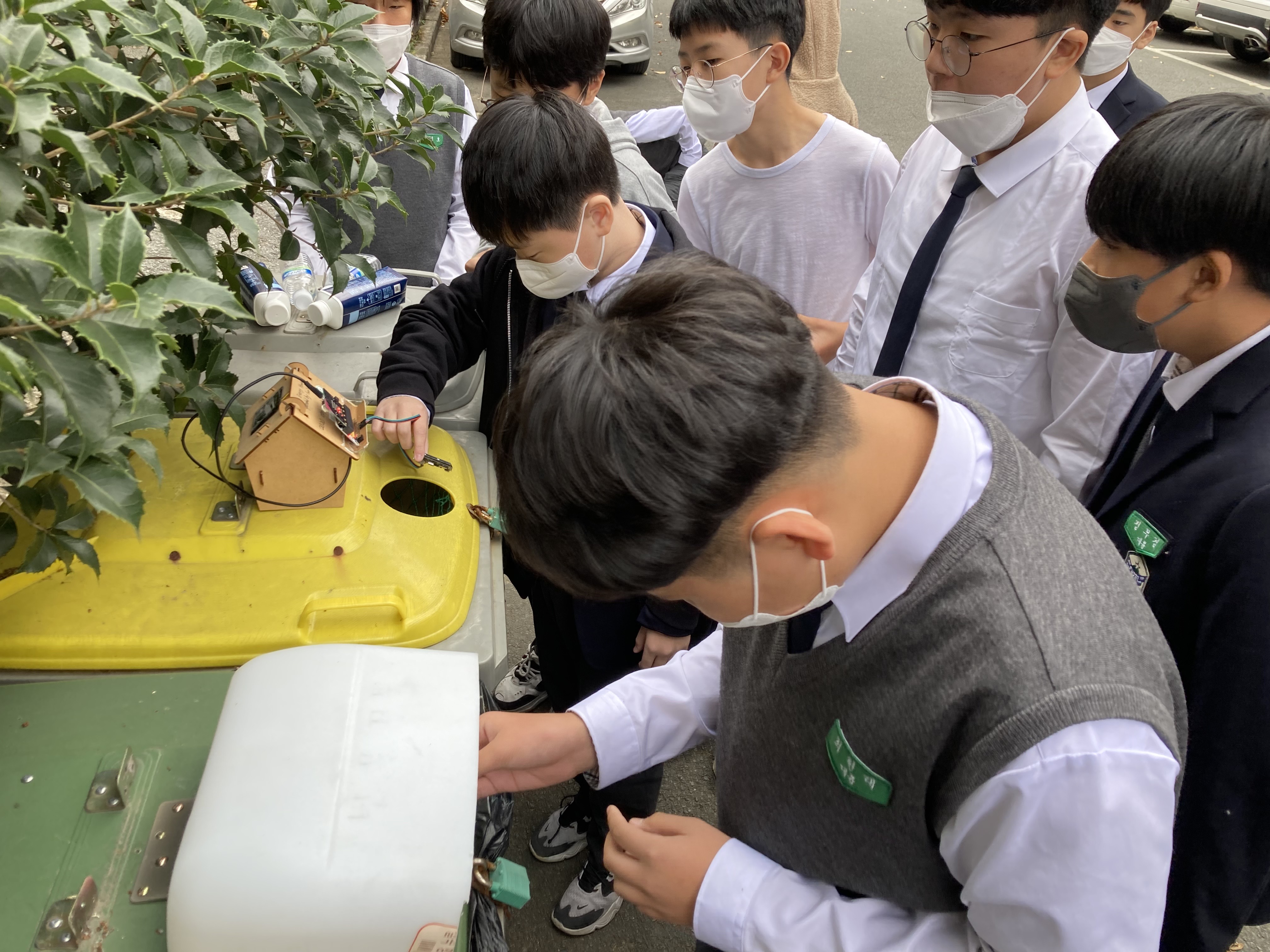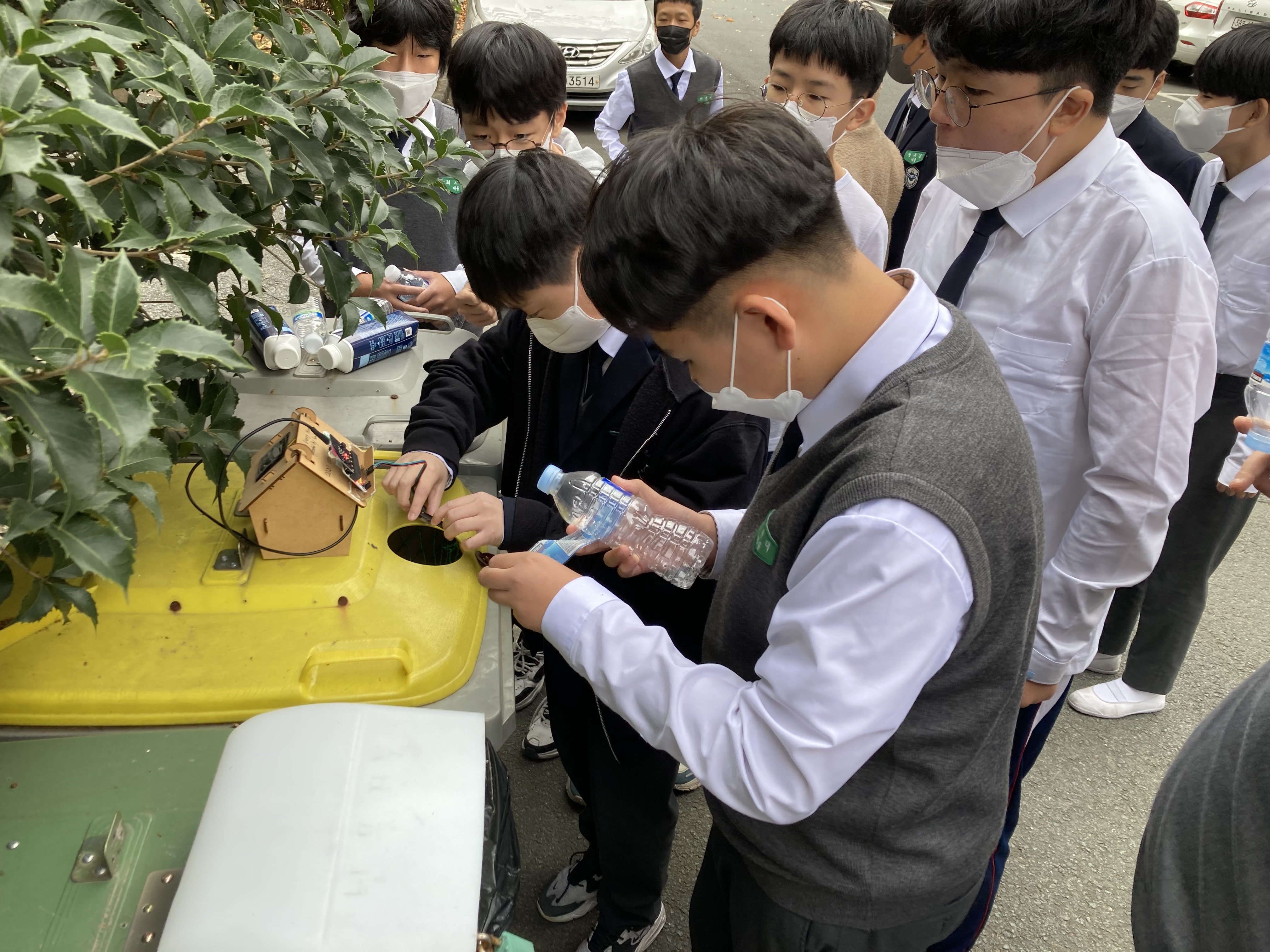 학생들은 플라스틱(투명페트병과 유색페트병 등의 일반플라스틱)을 배출할 때, "투명페트병 인식 장치"에 인식을 시켰습니다.