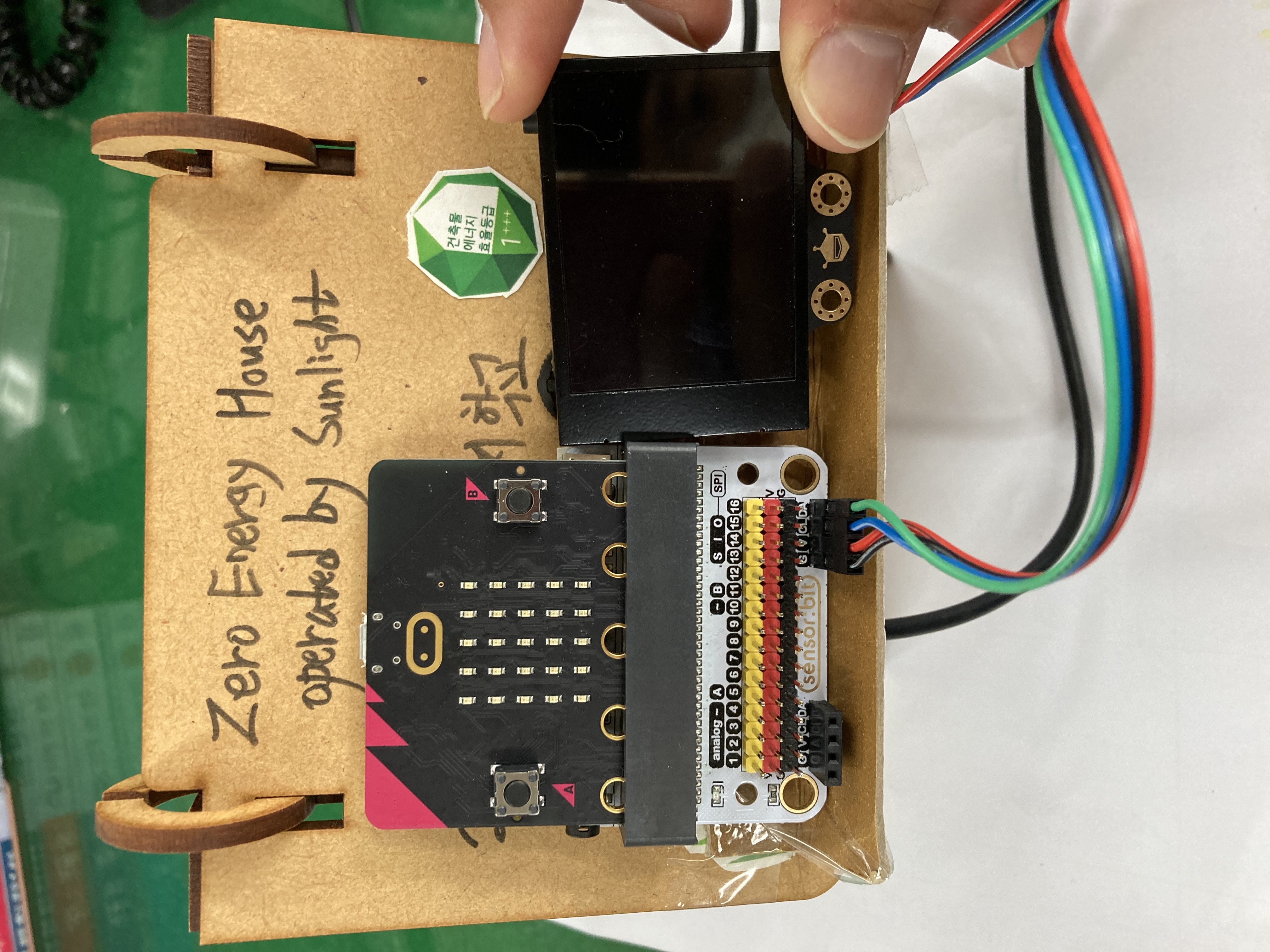 투명페트병 인식 장치가 작동할 수 있도록 에너지를 공급해야 하는데, 사진의 '집 키트' 상단에 붙어 있는 태양전지판을 이용하여 에너지를 공급한다면 장치를 친환경적으로 이용할 수 있을 것입니다.