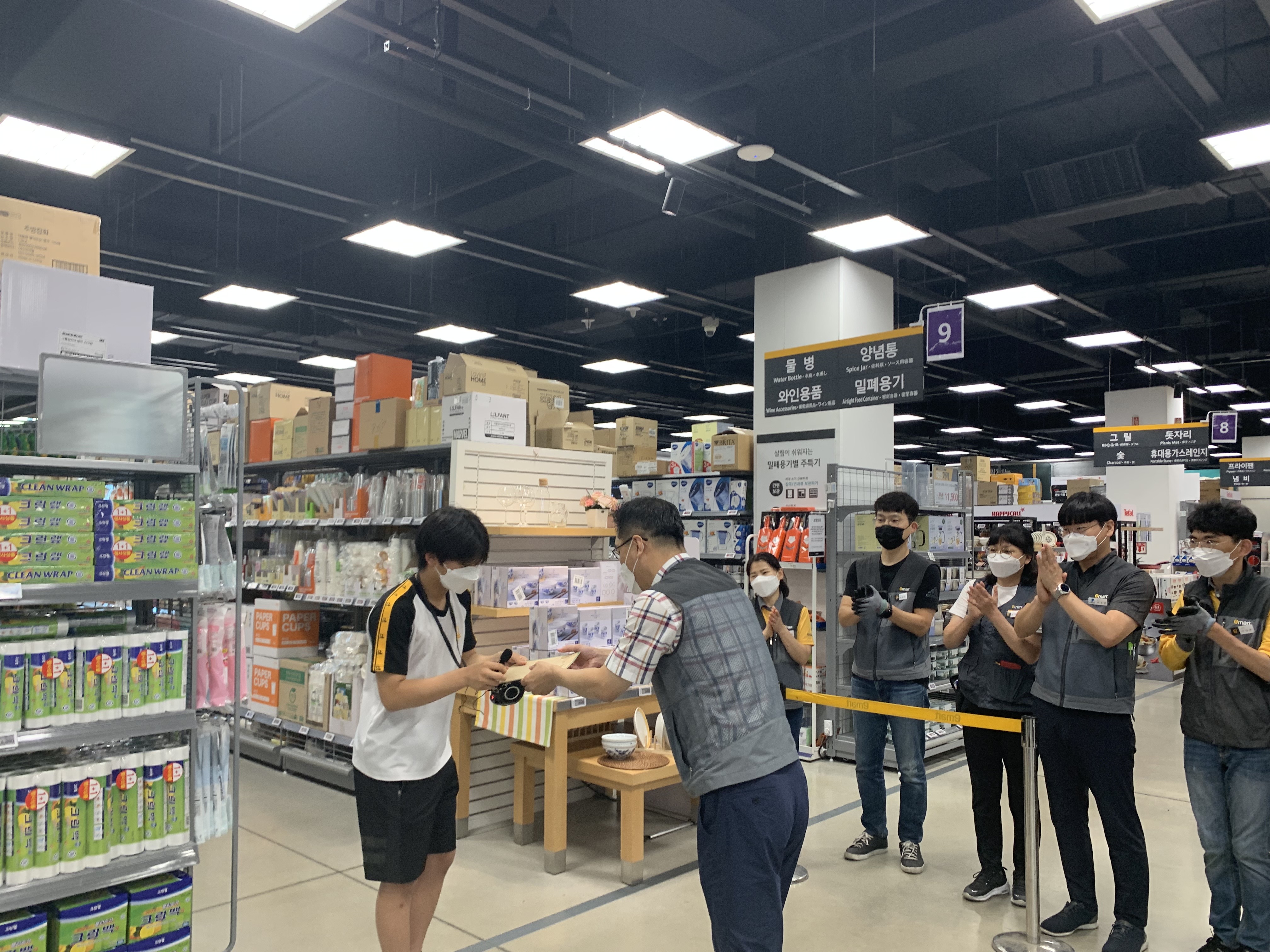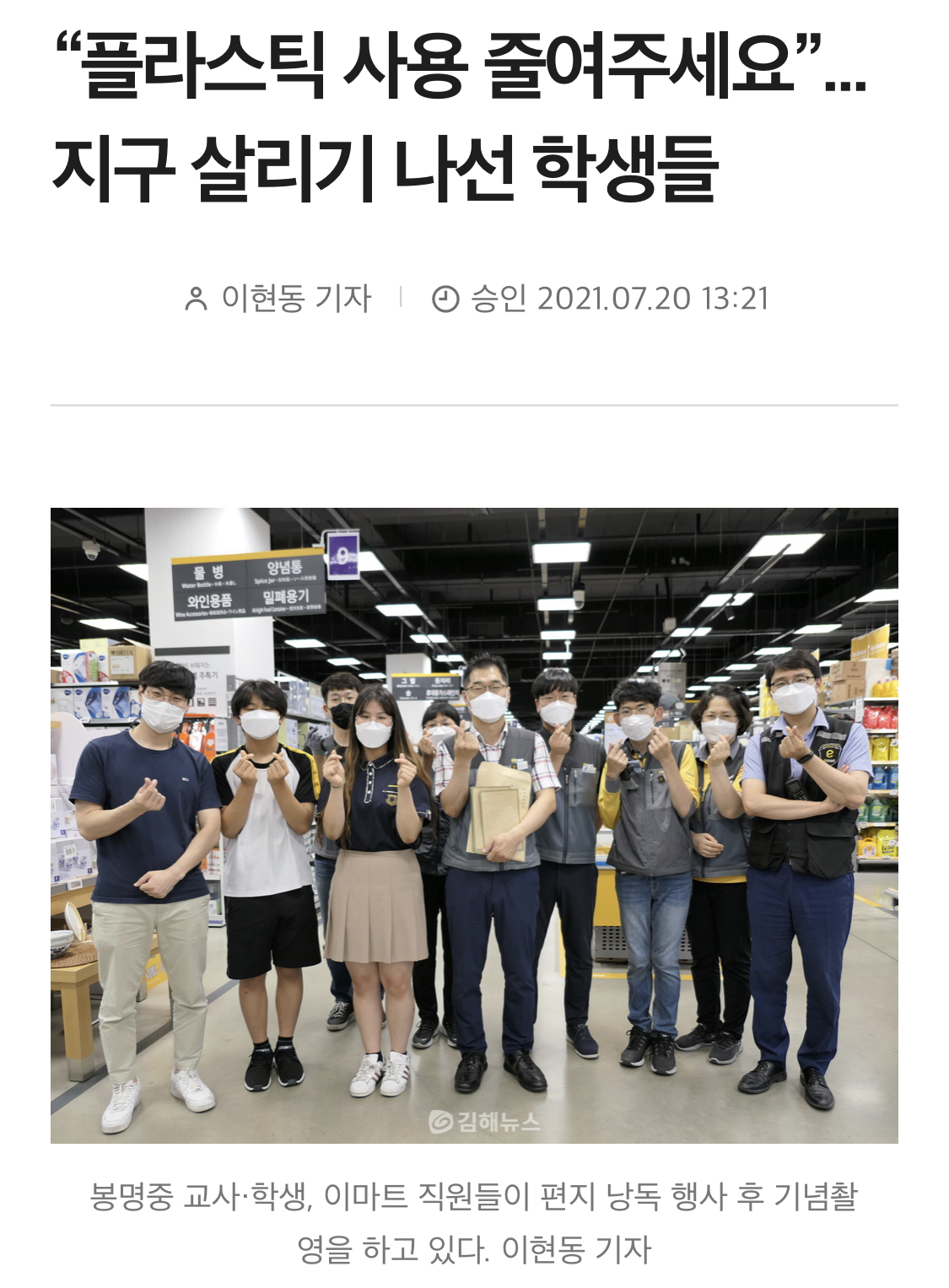 대형마트에는 일회용품과 과대포장의 사용을 줄여달라는 편지를 직접 손편지로 쓰게 되었습니다. 2021년 추석 전 우리는 4인으로 구성된 모둠을 이루어 김해시의 쓰레기 문제에 대해 공부하였고 왜 일회용품을 줄여야 하는 지, 과대포장이 어떤 문제를 발생 시키는지, 김해 뿐만 아니라 전국에 쓰레기 대란 문제가 다가올 수 있다는 것에 대해 대형마트에 알리고 호소하는 편지를 보내 직접 전달하고 게시하여 일반인들도 알 수 있도록 함께 노력하였습니다.