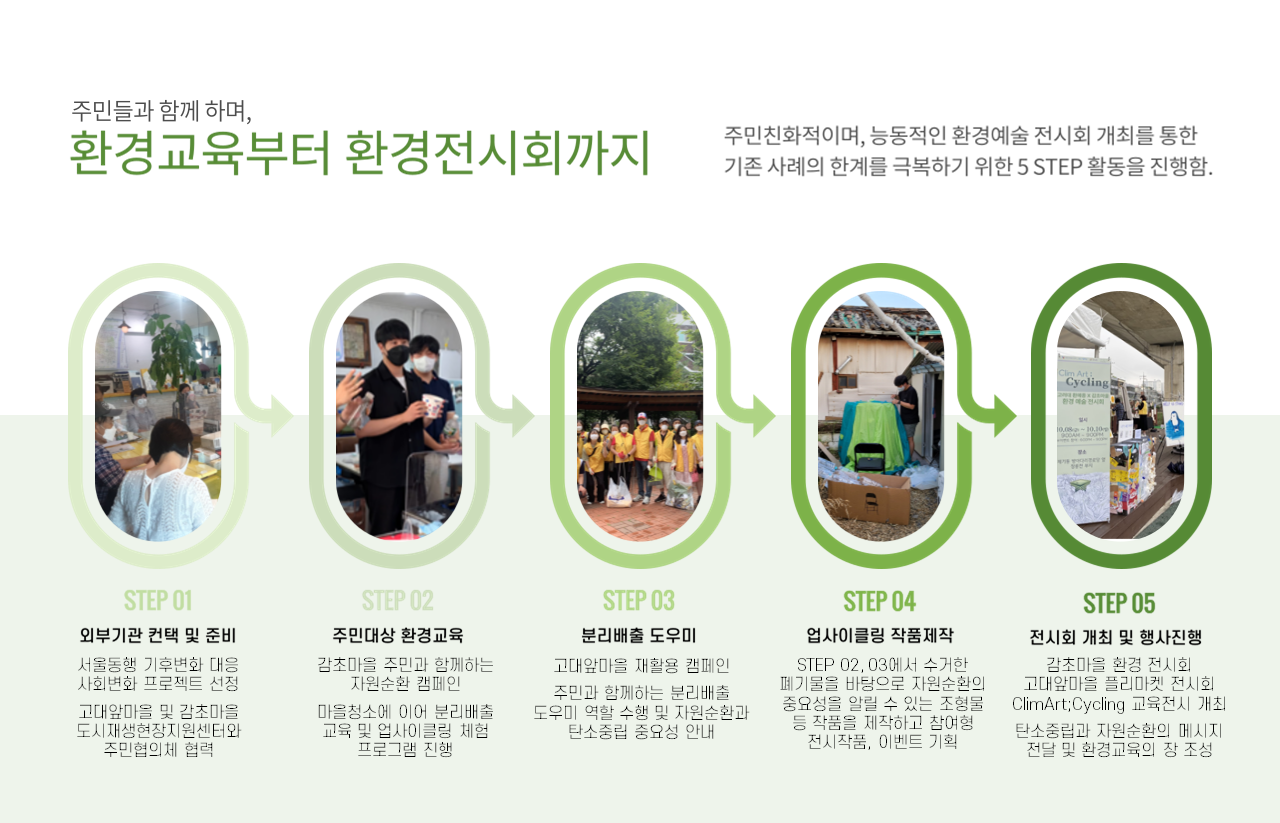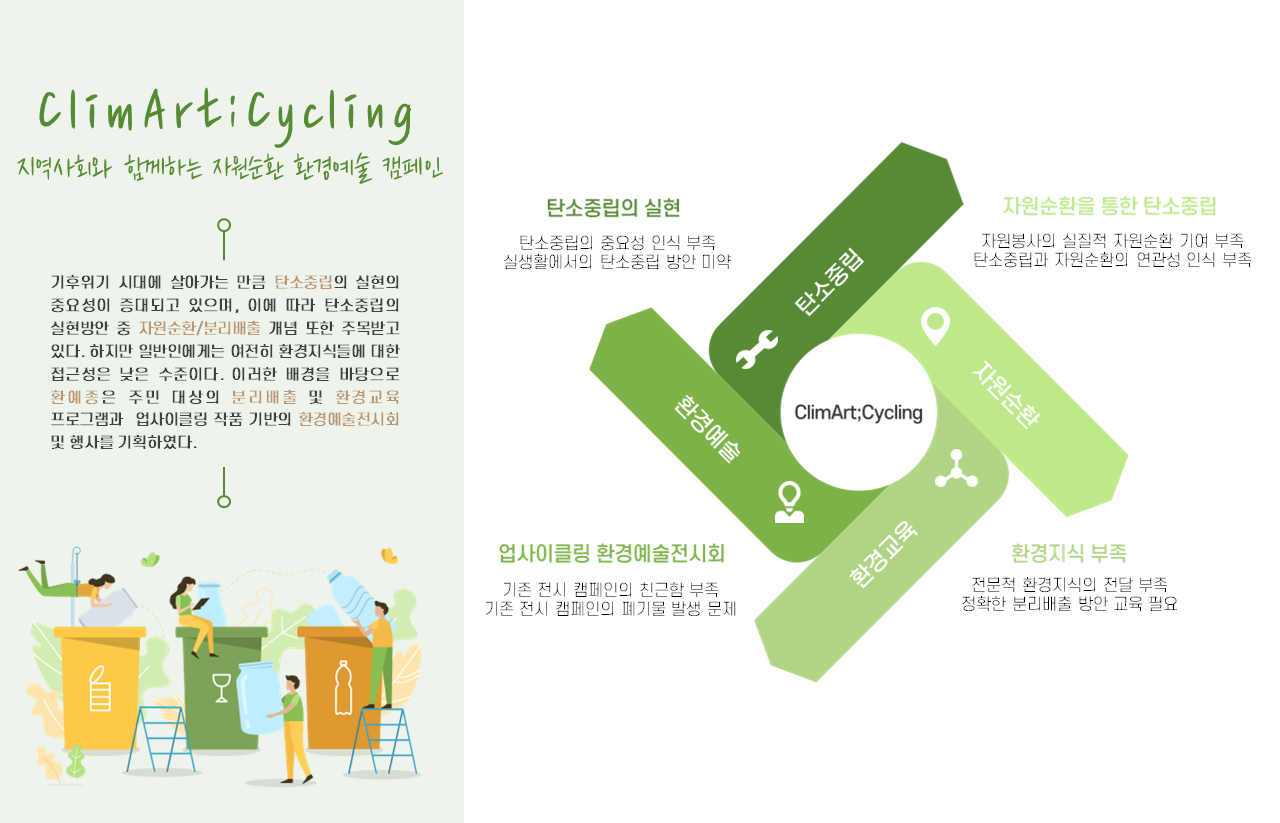 처음에는 단순히 폐기물로 인한 환경오염의 심각성을 알리는 활동을 생각하였으나 우리 주변 실생활에서 나오는 폐기물을 재활용하는 모습을 직접 보여드리고 분리배출과 재활용을 함께 도우면서 환경교육을 진행하여야 더욱 효과적인 가치 확산이 될 것이라 판단하였습니다. 이에 인근 주민, 대학생들과 함께 하는 캠페인으로서 분리배출을 직접 돕고 재활용의 가치를 보여줄 수 있는 기후변화 대응 환경 전시·교육 활동인 ClimArt;Cycling 캠페인이 탄생하게 되었습니다.