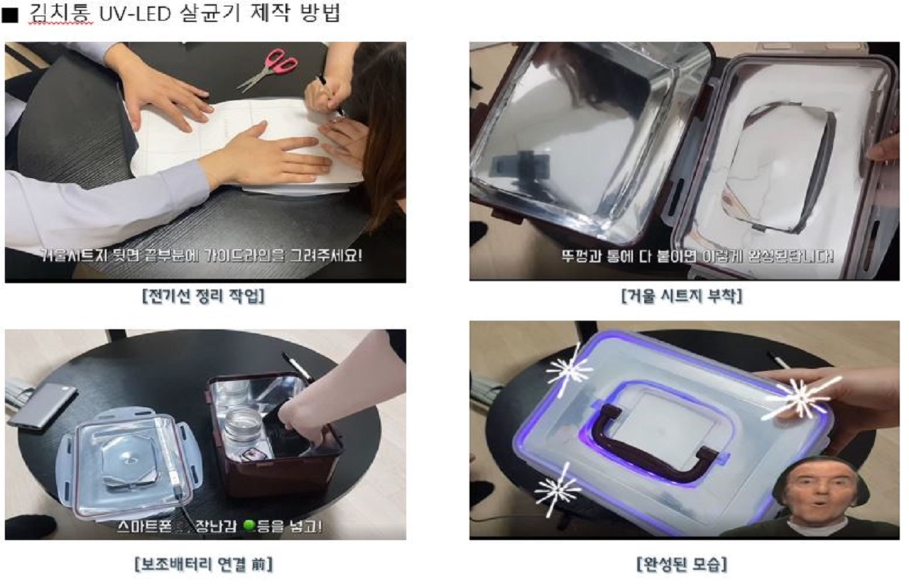 *아이디어 작성 내용 中 실제 ‘색상이 있는 김치통 UV-LED 살균기’ 제작 목적에 있습니다. 해당 봉사활동 프로그램을 머리에서 ‘생각’만 하는 것이 아닌 ‘실천’을 하고 싶었습니다. 이번 활동 사례에서는 텍스트로 끝나는 것이 아닌 단체가 아닌 개인이 직접 비대면으로도 제작 가능하도록 해당 업사이클링 제품 제작 가이드라인 영상도 촬영해 보았습니다.