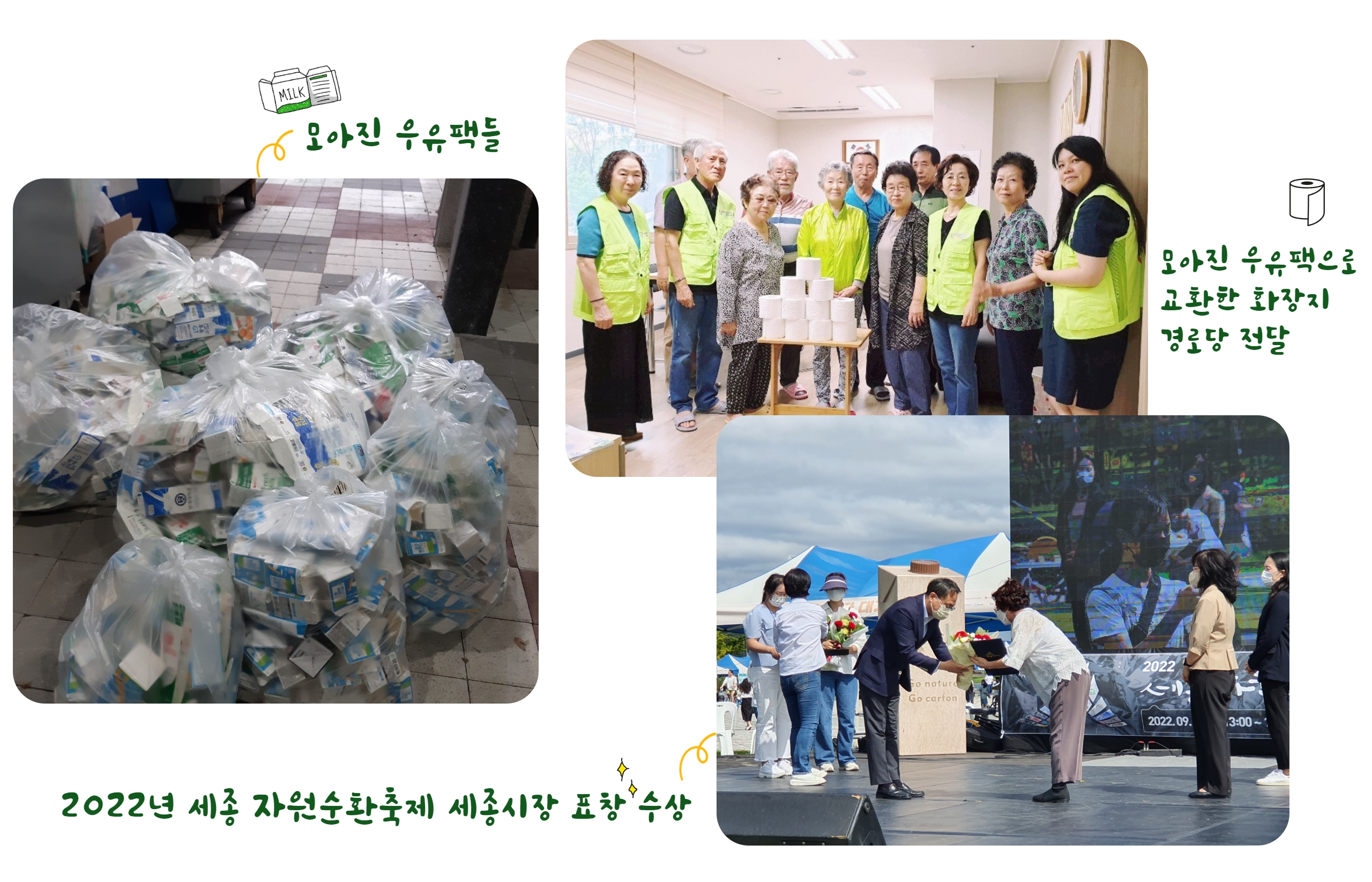 - 매월 60kg~70kg씩 수거된 우유팩은 30롤 2팩씩 화장지로 교환하여 지역의 경로당과 어린이집에 기부하고 있으며, 2021년 12월에는 그동안 우유팩을 모아 교환한 화장지 30롤 10팩을 세종시자원봉사센터에 기증하여 집수리 대상자에게 전달하였습니다.