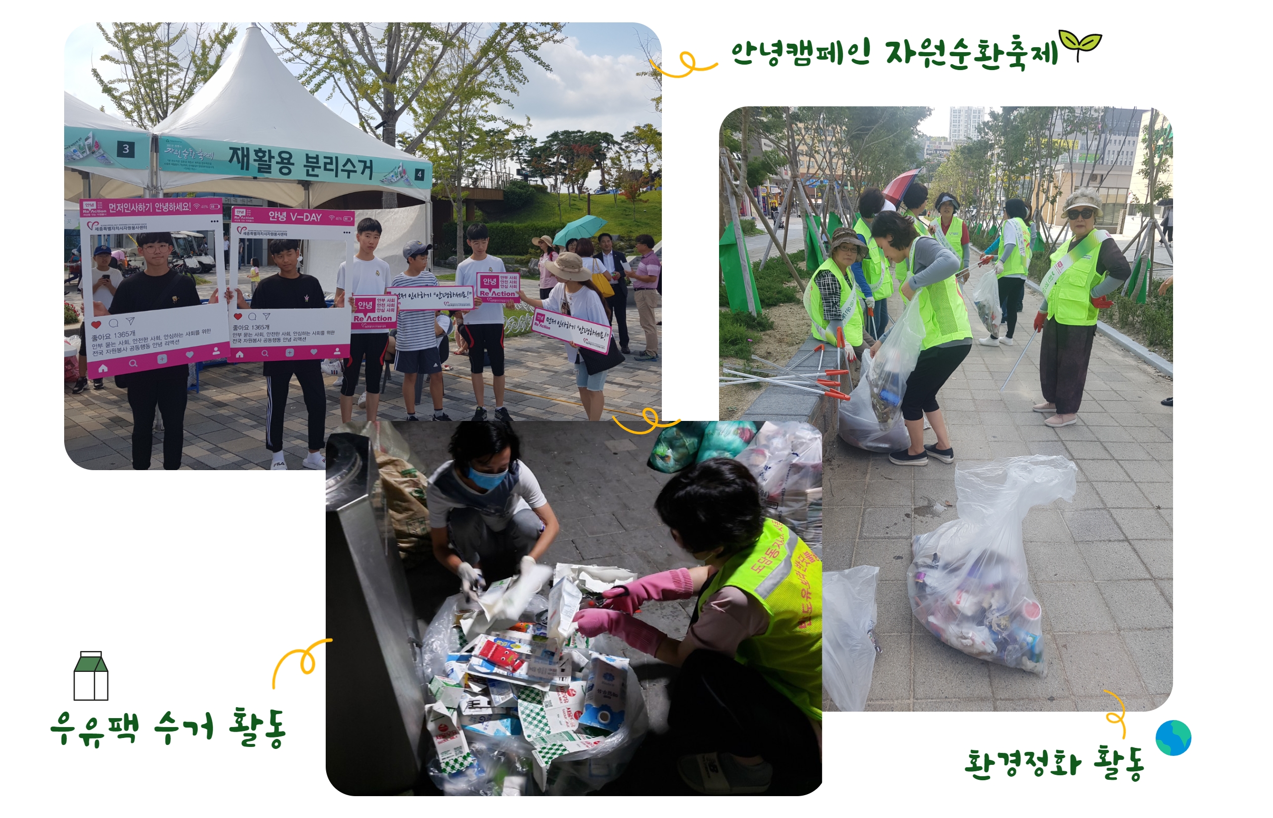 현재는 환경정화, 재활용 모니터링, 우유팩을 수거하여 화장지로 교환하고 지역 경로당, 주민센터 등에 후원하여 자원선순환에 힘쓰고 있으며 사례를 알게 된 인근 카페 사장님들의 우유팩 수거에 동참하고 있습니다.