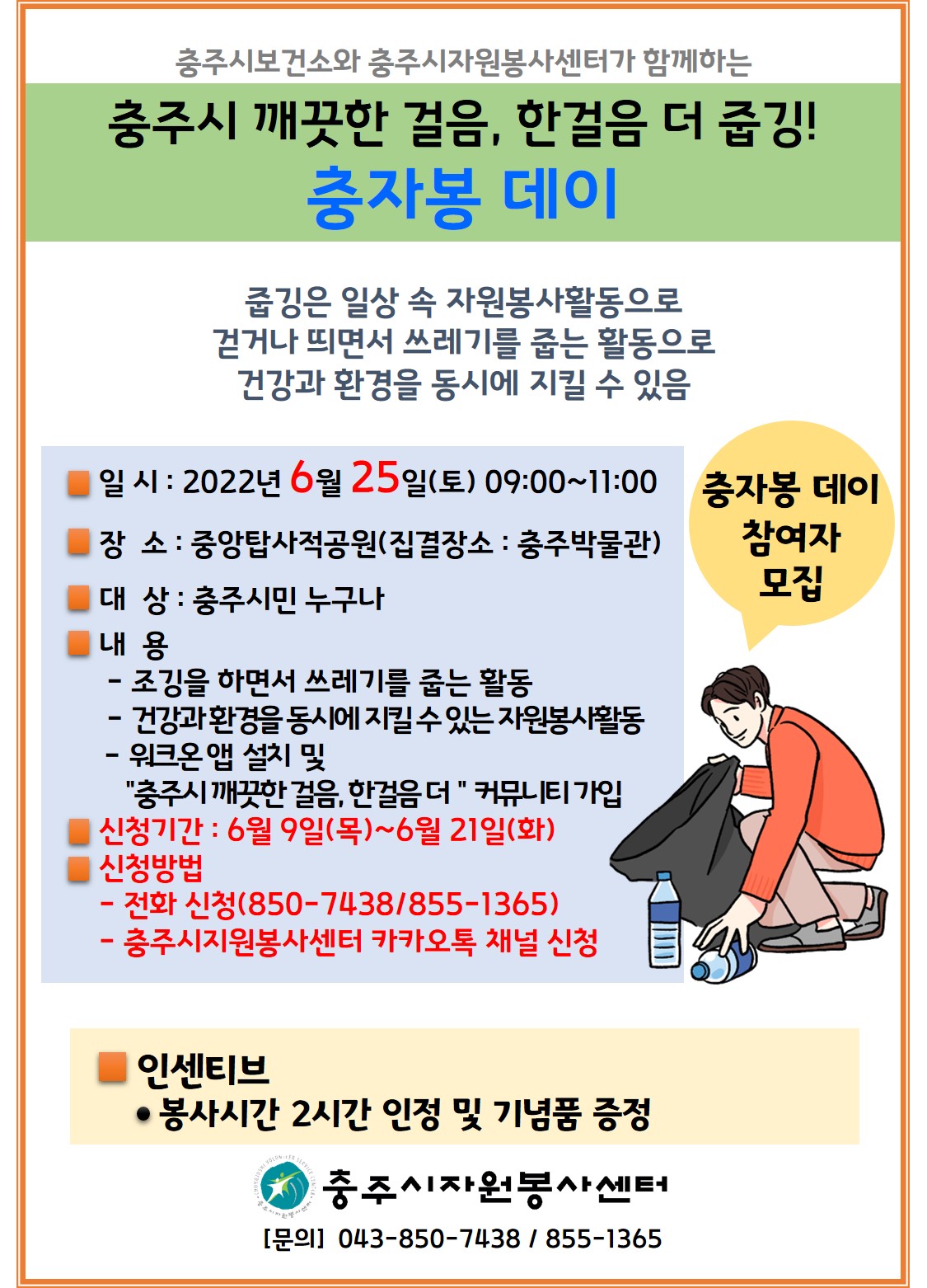 "깨끗한 걸음, 한 걸음 더! 자원봉사활동"은 충주시보건소와 충주시자원봉사센터가 함께 하며 워크온앱 커뮤니티와 카카오톡 채널을 활용하여 상시 진행하고 있습니다.