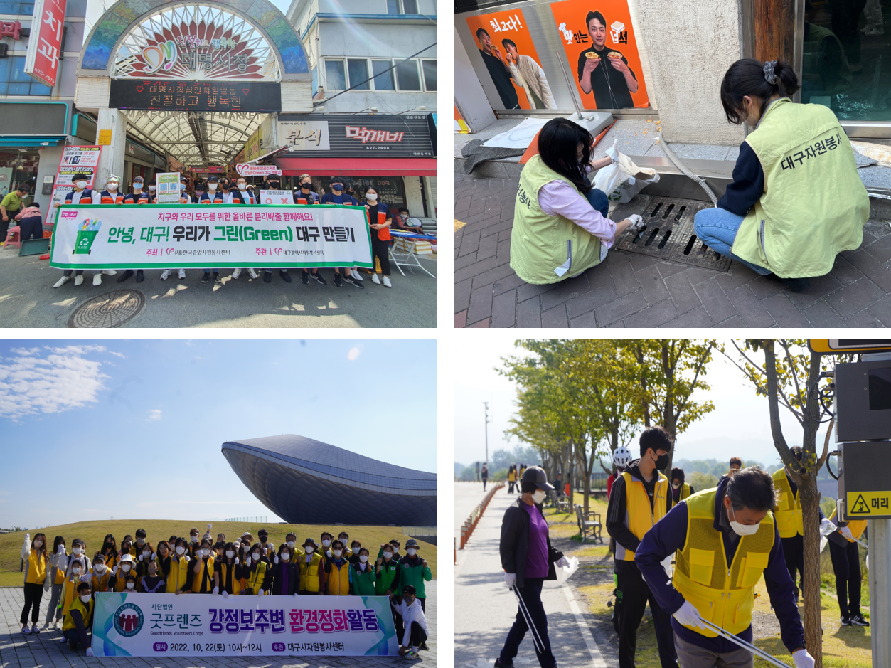 두 프로그램은 달구벌one팀과 자원봉사센터로 참여대상이 국한되어있지 않습니다! 요플래는 100개, 치유깅은 50개의 지역사회기업, 대학교, 기업이 참여하여 범시민적 자원봉사활동이 추진되었고 이를 통해 다양한 분야에 속한 시민들이 기후위기에 대응할 수 있었습니다. 대구 내 9개의 자원봉사센터에 수거함 설치를 완료했을 뿐만아니라 지역사회 다양한 기관에도 설치를 하여 시민들의 자원봉사활동에 대한 접근성을 낮추므로 누구나 참여할 수 있는 자원봉사활동을 추진했습니다.