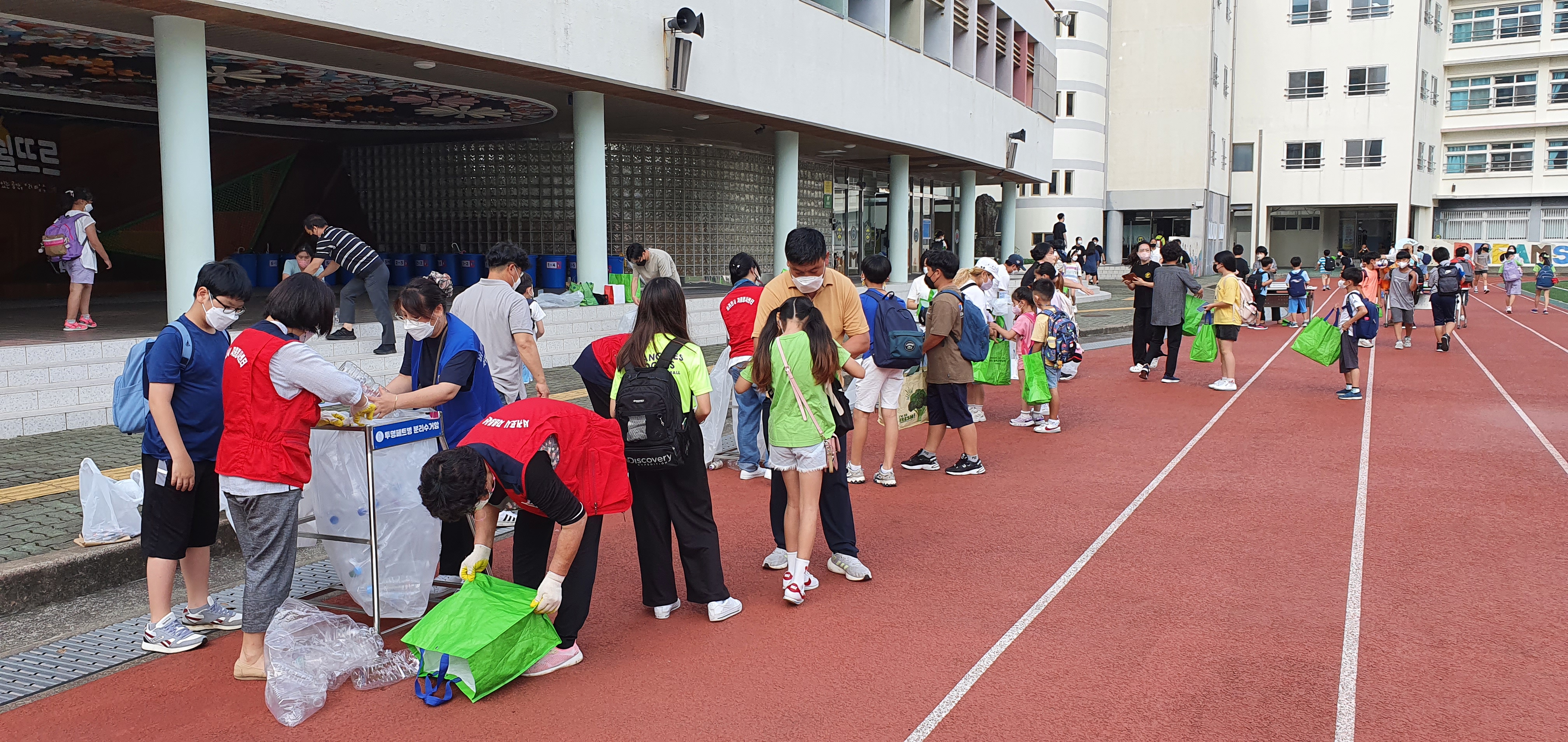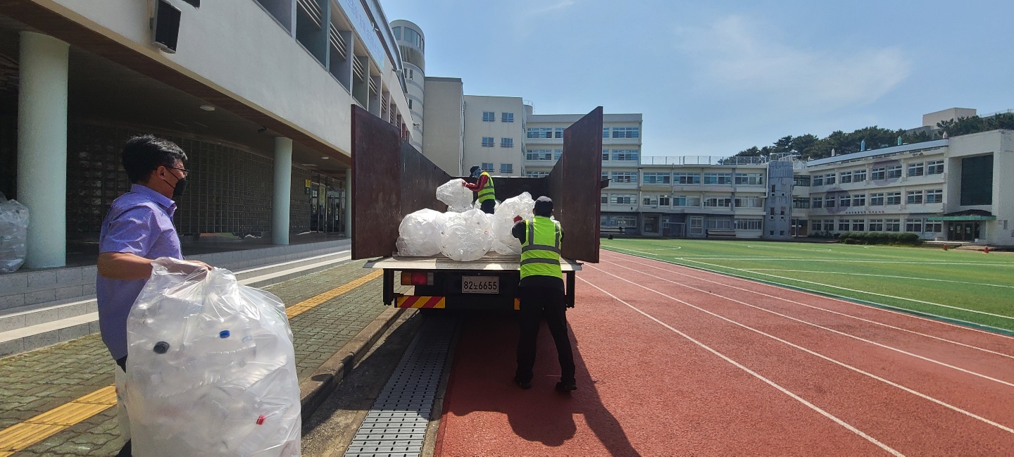 학생들이 각 가정에서 모아서 가져온 투명 페트병을 학생, 학부모, 교사, 자원봉사자와 함께