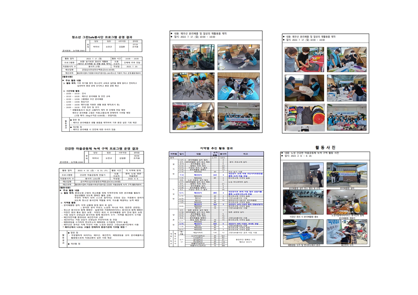 - 건강한 녹색마을 만들기 활동을 통해 폐건전지, 폐형광등, 폐우산 수거 및 교환을 통해 일상 생활 기회 확산