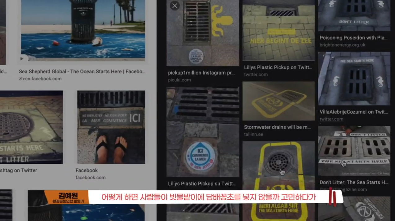 환경운동연합에서는 시흥시와 광운대 공공소통연구소가 함께 진행했던 사례와 마찬가지로, 셉티드 기법을 활용해 빗물받이에 무단투기되는 담배꽁초의 양을 줄이고자 하고 있어요.