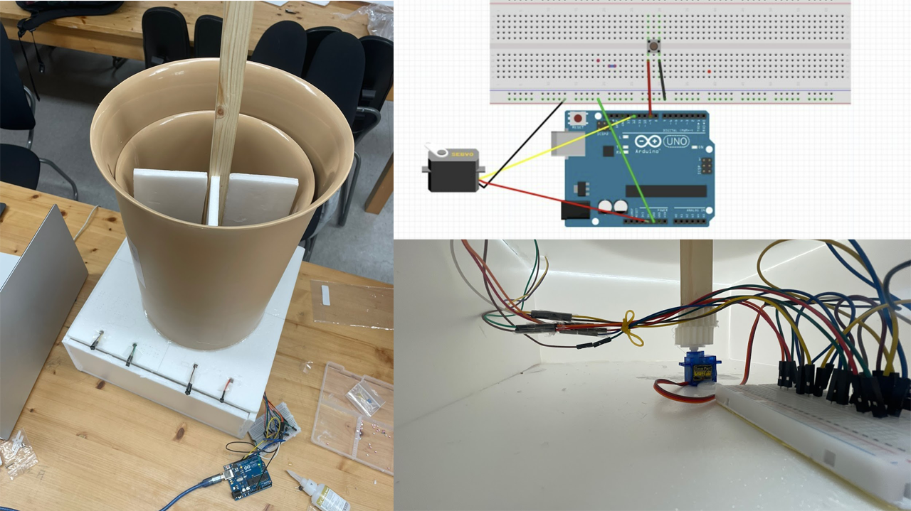 쓰레기를 버리긴 하나, 잘못된 쓰레기통에 쓰레기를 버린다는 것이 문제였습니다. 따라서 저희는 쓰레기통의 구조를 변화시켜 쓰레기의 종류를 감지하면, 자동으로 쓰레기통 내부가 회전해 사용자의 올바른 쓰레기 분류를 유도할 수 있는 장치를 기획하였고, 실제 다양한 센서를 활용해 구현하여 실제 설치하는 활동을 진행하였습니다. [활동 과정 : https://sites.google.com/dshs.kr/lee-sin/%EB%A9%94%EC%9D%B4%ED%82%B9?authuser=0] 장치의 주된 기능은 사용자의 올바른 분리배출을 유도하는 것으로, 쓰레기의 종류를 감지했을 때 장치 내부가 회전하여 쓰레기를 분류하는 것입니다. 추가적으로, 장치에 점자를 장착하여 쓰레기의 구분이 힘든 시각장애인까지 고려하였습니다.