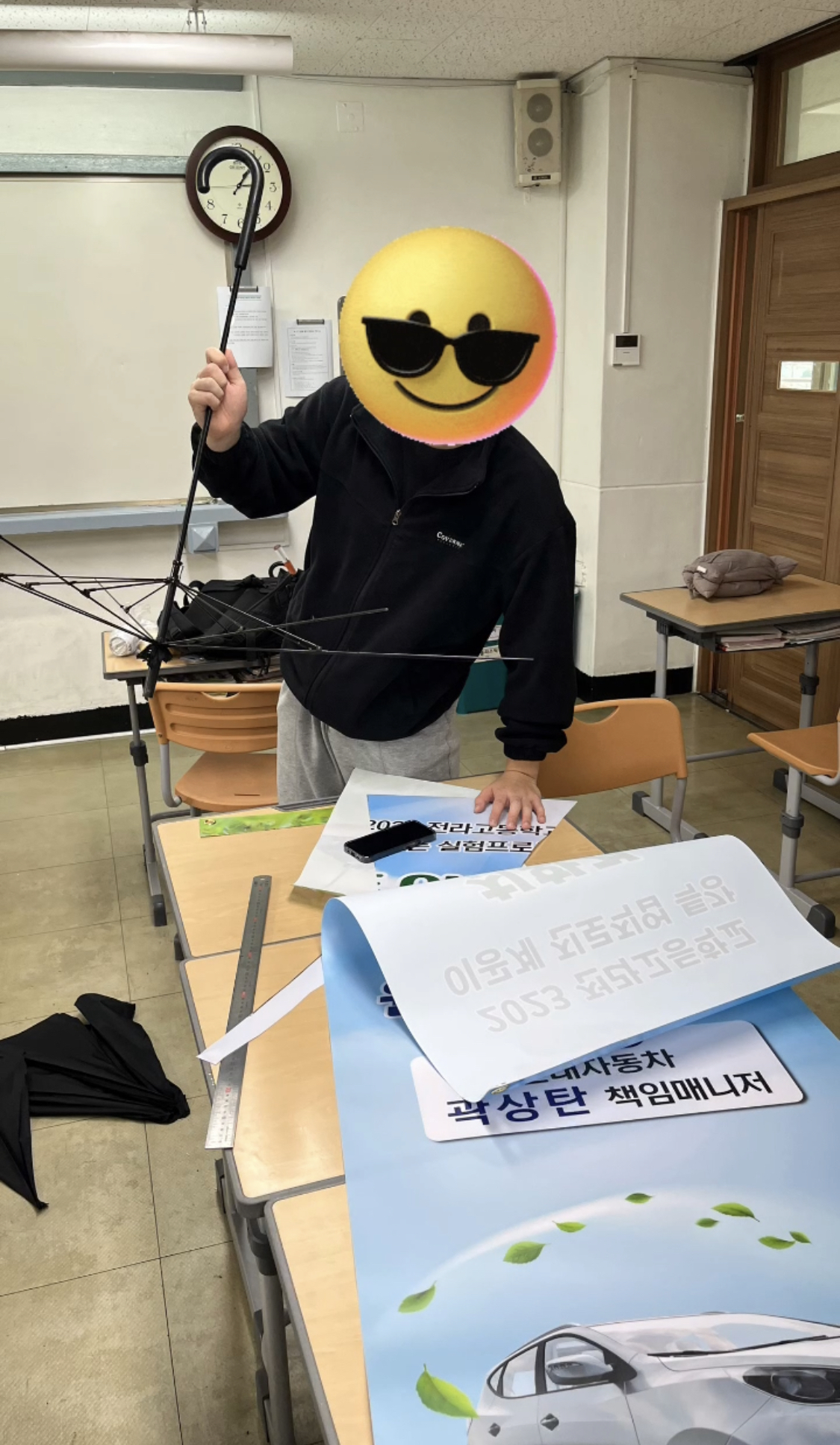 저는 일단 학교 쓰레기통에가서 구멍이나 버리진 우산들을 모아봤었습니다 . 그리고 이우산들을 물로 씻어 말렸습니다 . 다음으로는 학교선생님께 양해를 구한뒤 일회적으로 쓰고 버려진 플라스틱 재질인 간판들을 모았습니다. 그리고 구멍난 우산 비닐들을 가위로 다 제거한뒤 자로 직접 길이를 다 측정하여 우산 규격에 맞게 간판을 잘라 모았습니다. 그런 후 지지대에 끼워 맞춰 일회용 간판으로 만든 우산을 제작하였습니다!!