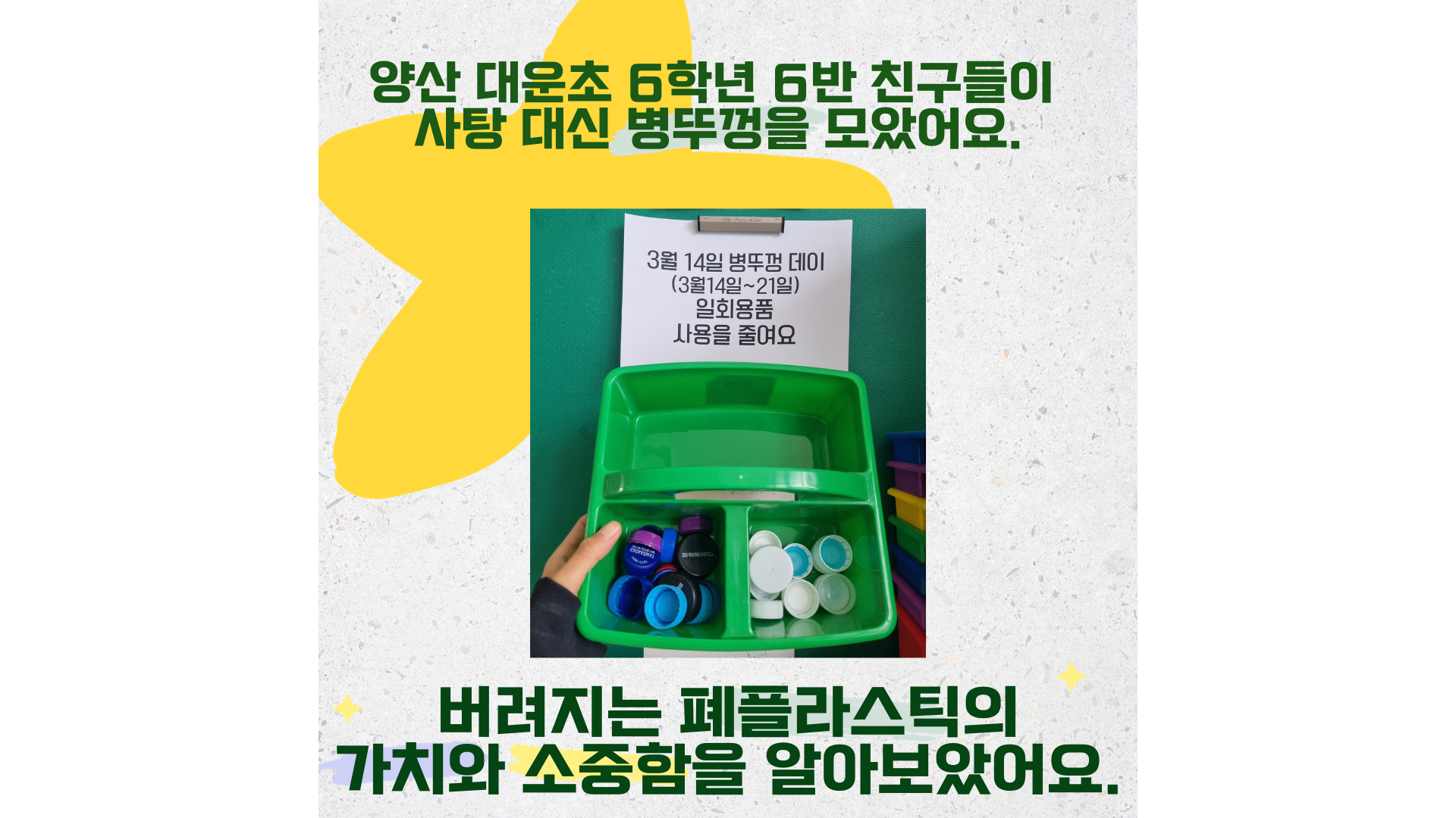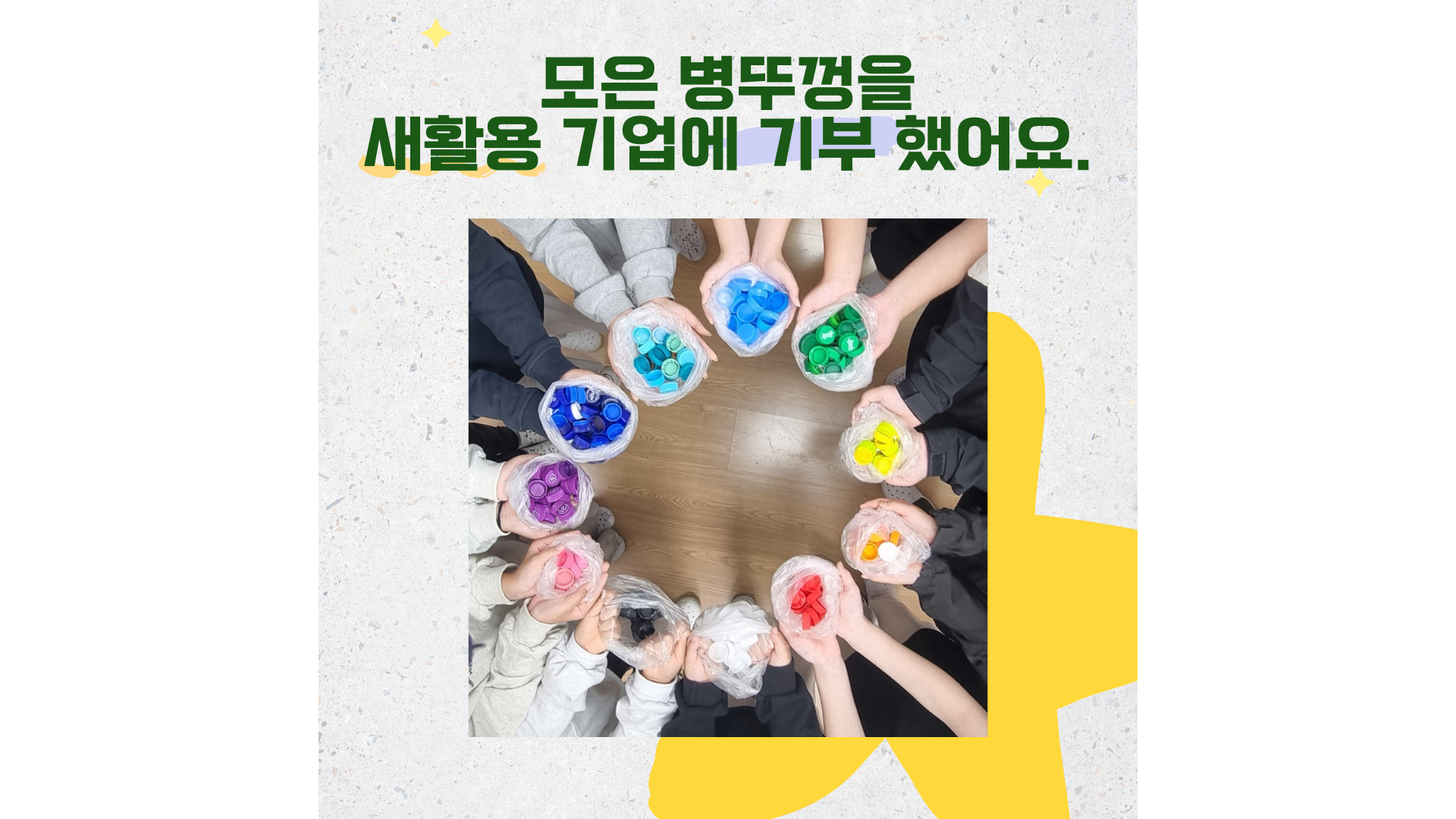 3월 14일부터 총 일주일 동안 병뚜껑 데이를 정해서 우리가 사용한 플라스틱 병뚜껑을 모았습니다. 병뚜껑을 모으면서 우리의 플라스틱 배출량에 대해서 반성하고 새활용의 가치를 배웠습니다. 병뚜껑 데이를 통해 미래를 위한 지속적인 제로 플라스틱과 탄소중립 생활을 위한 실천 태도와 의지를 길렀습니다.