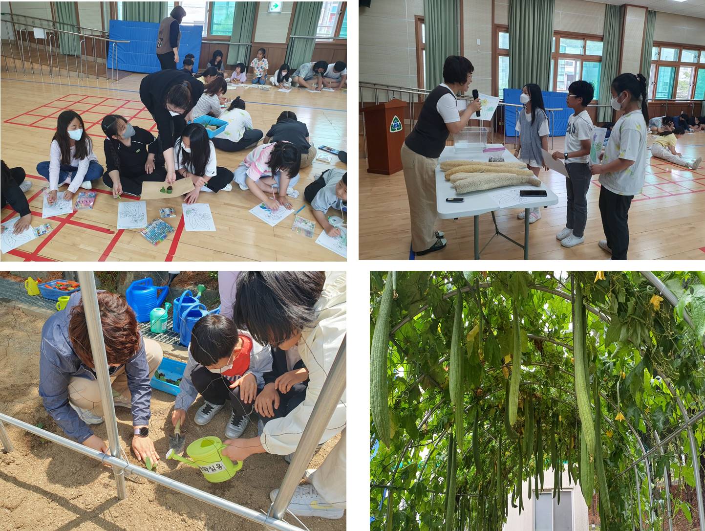 1. 수세미 재배 교육을 하기 위해 자원봉사자들이 수세미 모종을 직접 싹을 튀우고, 심고, 자라는 과정을 학생들과 함께 하며, 학생들은 각자의 수세미에 이름을 지어주고 수확해서 가정에서 사용하도록 함.