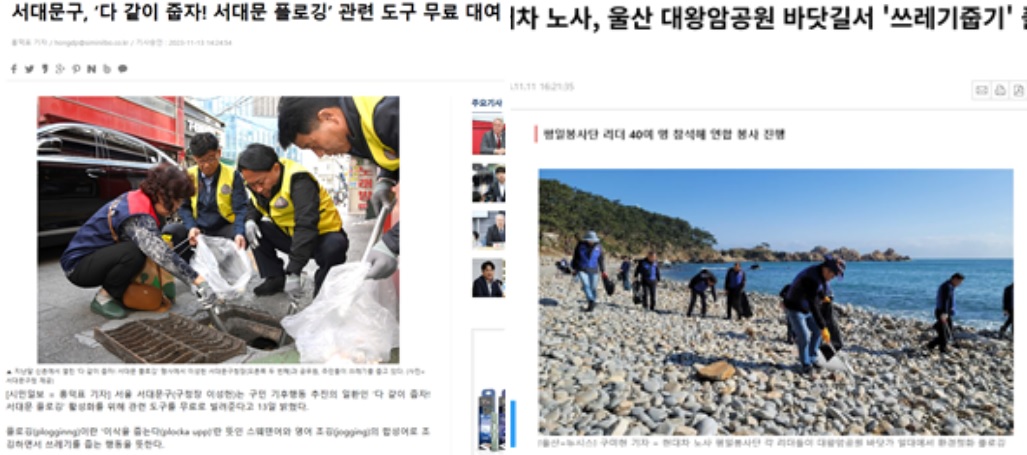 최근 플로깅은 다양한 모습으로 발전해가며, 해변, 강가 등 특정 장소 중심의 활동 혹은 시민, 학교, 기업 등 주체 중심의 활동 등 다양한 활동이 이루어지고 있습니다. 하지만 필요한 곳에 필요로 인해 활동이 이루어지는 것이 아닌 대외적 보여주기식 활동이 늘어나고, 환경정화 활동을 위해 일회용품을 사용한다던지, 쓰레기와 재활용품 모두 쓰레기봉투에 담아 처리 하는 등의 좋은 취지에서 시작되었던 활동들이 변질되어 가는 한계를 많이 보게 되었고 환경을 생각한 활동의 취지에 맞춰 완벽한 친환경 정화 활동으로의 보완이 되어야 한다고 생각합니다.
