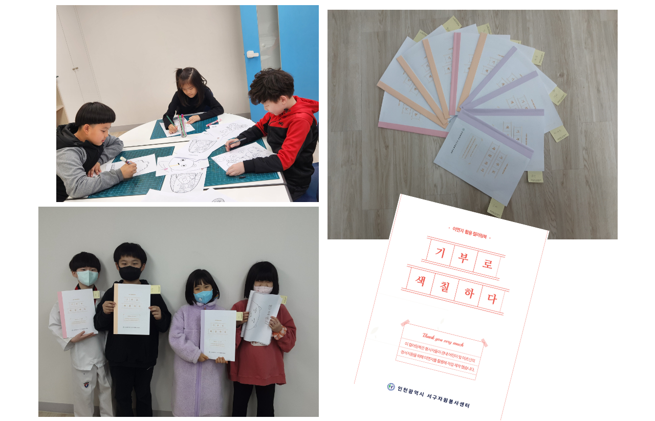 이면지 컬러링북은 기존에 스템플러로 찍어서 제출했던 컬러링북에서 조금 더 안전하고 완성도 높은 마감처리(마스킹테이프, 스카치테이프)로 변경 진행해 어르신들에게 안전한 컬리링북을 받는 기쁨을 드릴 수 있었습니다.