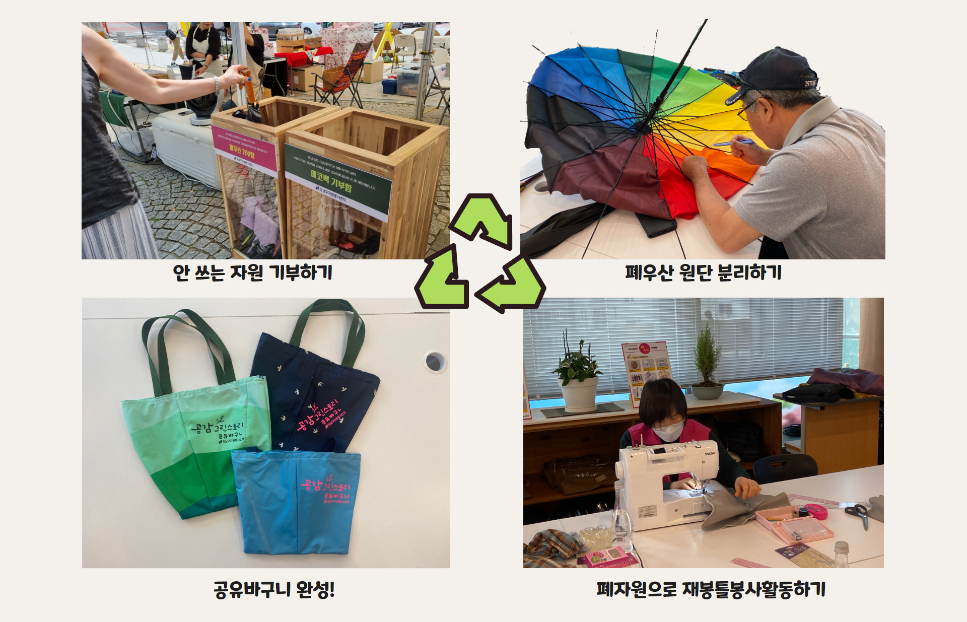 - 기부받은 헌 옷, 분리된 우산 천 등을 활용하여 공유바구니 만들기 재능봉사활동