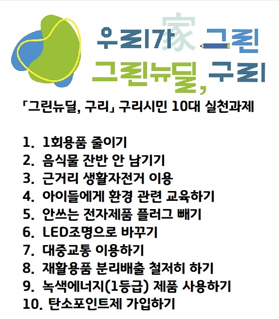 - 2021년 2월 구리시민을 대상으로 ‘그린뉴딜, 구리’ 구리시민 10대 실천과제를 선정하는 설문을 실시한 결과, 아래와 같이 선정되었다.