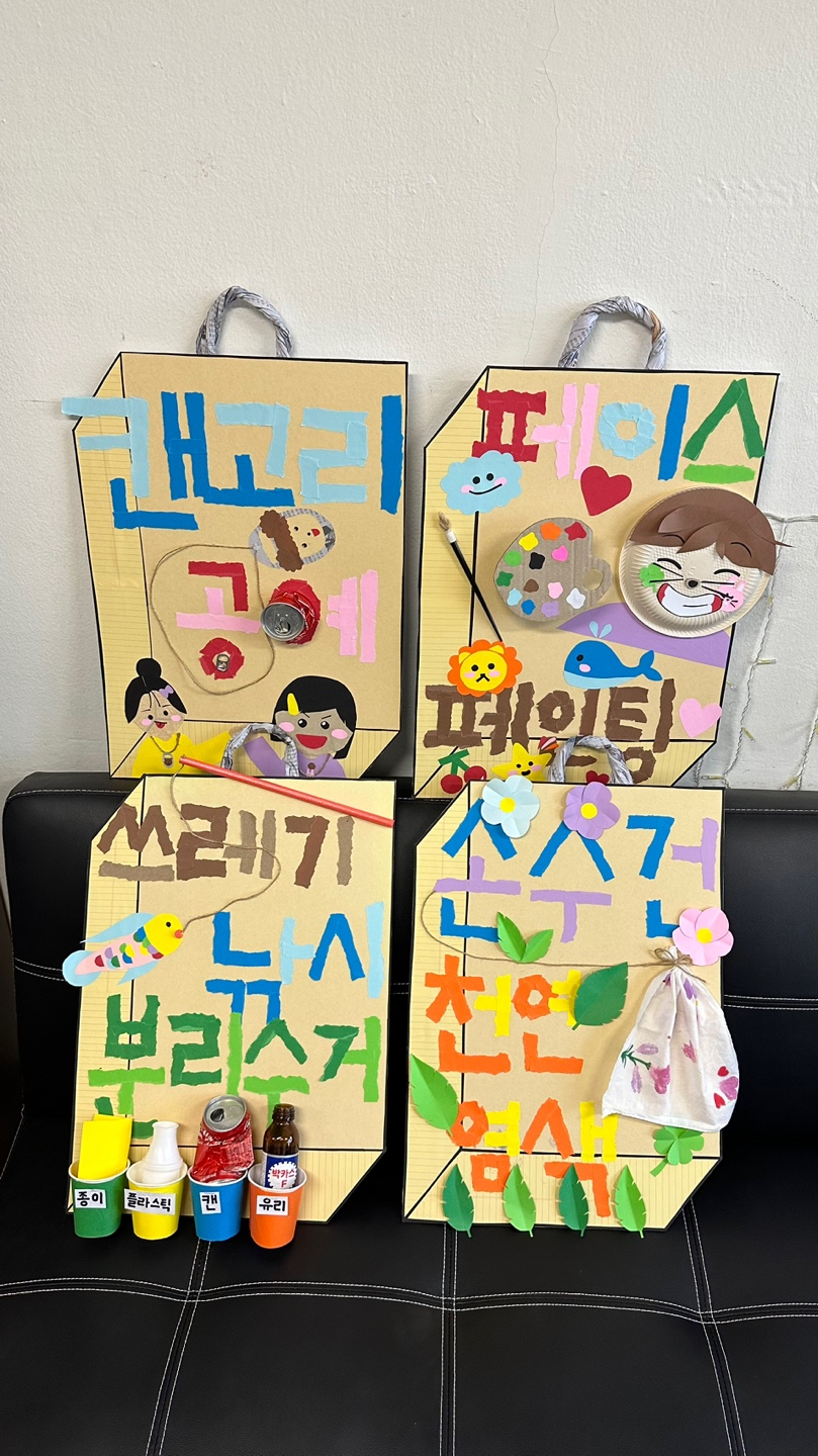 2022년 4월부터 2023년 10월 말 까지 총 6번의 두류공원 환경캠페인을 운영했는데 처음엔 아이들의 참여 유도를 위해 페이스페인팅, 바람개비 만들기 등 환경캠페인과는 연관이 적은 활동을 주로 진행 했습니다. 2번째 활동을 기획하고 참여하던 중 문득 아이들에게 환경교육과 친환경 비닐봉지를 나눠주긴 하지만 조금 더 환경을 생각한 프로그램을 만들면 좋겠다고 생각이 들었습니다. 세 번째 활동부터는 버려진 우유갑, 플라스틱 병 등을 재활용하여 두류공원 모형을 만들고 그 위에 분리수거 시 헷갈리기 쉬운 계란 껍데기, 과자 봉투 일러스트를 작게 뽑아 자석을 달고 아이들이 쓰레기 낚시를 통해 분리수거를 하는 활동 등 조금 더 환경을 생각한 활동을 구상하고 진행하였죠 이 뿐만 아니라 두류공원 특성상 버려진 맥주캔이 많은데 맥주캔 뚜껑을 재활용해 찰흙으로 맥주캔 뚜껑 목걸이 만들기 활동이나 직접 플로깅 한 쓰레기를 분리수거하는 활동 등 다양하고 아이들이 환경문제에 쉽게 다가갈 수 있고 활동 또한 친환경으로 진행하려 노력했습니다.