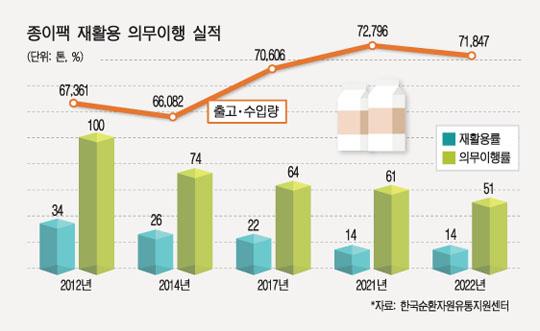 종이팩도 유리병과 마찬가지로 의무수거율이 있습니다. 하지만 종이팩의 의무수거와 재활용의 비율은 지속적으로 낮아지고 있습니다.