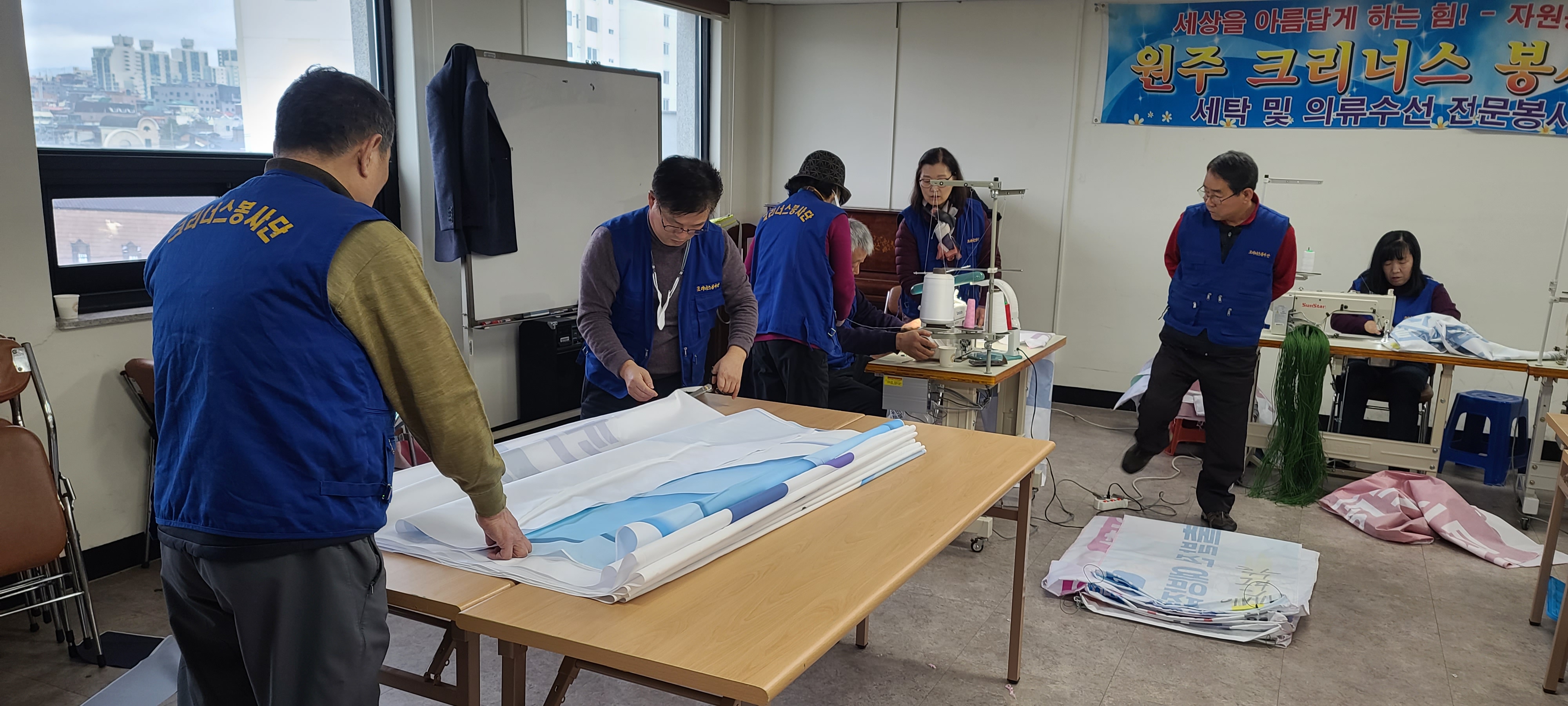 세탁업에 종사자들로 구성된 원주크리너스봉사단이 폐현수막을 수거하여 재활용품 부대를 만들어 사회복지시설에 기부하는 봉사활동 전개