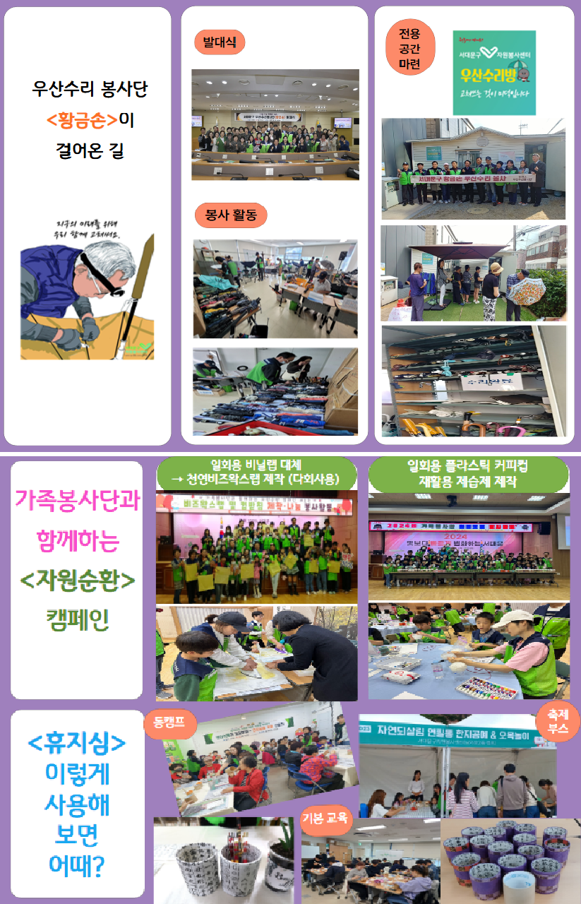 - 우산수리 재능봉사단 <황금손> 발대식 및 본격 봉사 활동 개시 ☞ 2023년 4월 ~ 계속: 우산 수집 및 분리 지속 병행