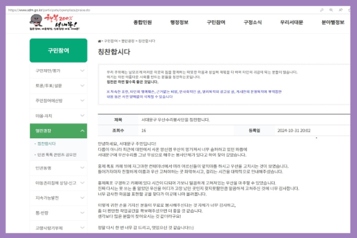 또한 우산 수리에 대한 120 칭찬 글(2023.7.12. )이나 서대문구 홈페이지 칭찬 : 38회 (2024.10.31.기준) 등은 주민 만족도가 높음을 시사하는 성과라고 볼 수 있습니다