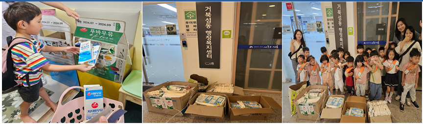 -아나바다의 의미를 알아보고 안 쓰는 물건과 나에게 필요 없는 물건을 나누어 보는 경험을 가졌습니다. 우리가 만든 장바구니를 사용하고, 병뚜껑과 우유팩을 모아온 가정에는 각자 준비한 통에 주방세제를 담아드리는 리필스테이션을 운영했습니다. 부모님 및 지역 주민분들께서 물품 기증 및 참여해 주셨으며, 수익금은 지역사회 복지재단에 기부했습니다.