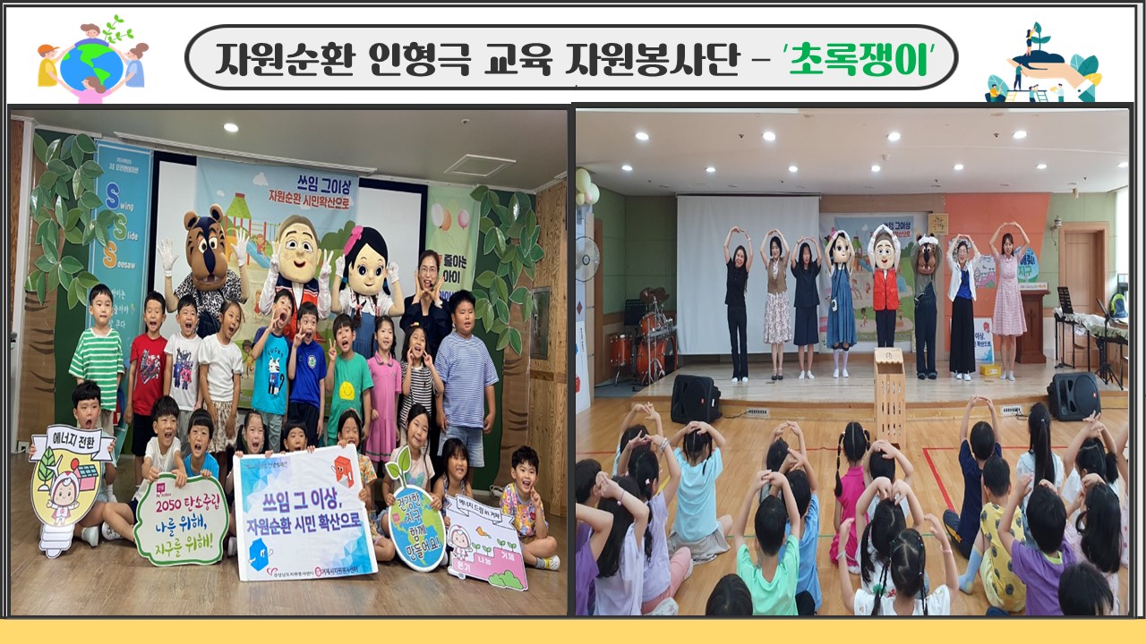 자원순환 인형극 전문교육을 받은 봉사자들은 자원=초록에 이르는 것에 목표를 두고 ‘초록’의 속성을 많이 가진 사람, ‘초록’과 관련된 일을 직업으로 하는 사람의 뜻으로 초록쟁이 자원봉사단을 구성하여 실제적인 활동을 펼치게 되었다.