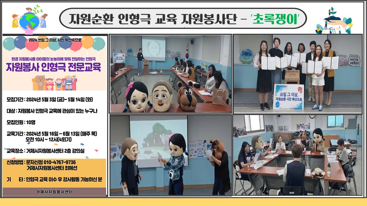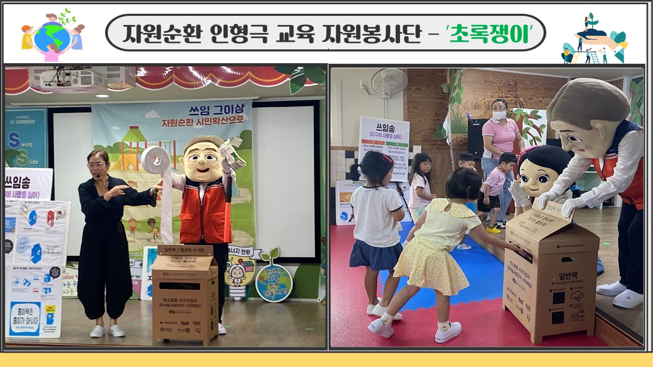 자원순환 인형극 전문교육을 통해 자원순환의 필요성과 실천방법 이해에 대해 인형극으로 시민들에게 알리는 리더 자원봉사자가 만들어졌고, ‘초록쟁이’ 자원봉사단체가 구성되어 전문적이고 지속적인 자원봉사활동으로 이어졌다.