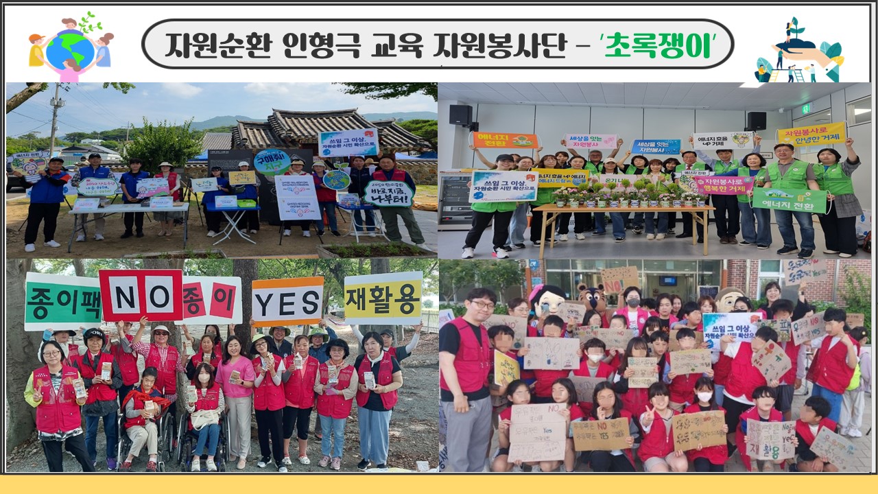 올해는 자원봉사영역에서 환경보존활동 방법의 다양화를 위해 자원봉사자 중심의 자원순환 인형극 교육 봉사단을 구성하여 재활용 가치에 대해 시민들에게 더 친근하고 알기 쉽게 다가가기 위한 새로운 여정을 위해 나아가고 있다. 이에 단순한 환경에 대한 관심에서 자원봉사자들에게 성장과 자기개발의 기회를 부여하고 함께 공동의 목표를 이뤄내는 경험을 통해 지역사회의 중요한 참여자 이자 실천을 할 수 있도록 자원봉사자의 성장을 돕기 위해 '자원순환 인형극 교육 봉사단'을 양성해 활동하고 있다.