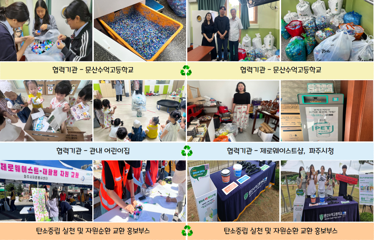 ‘▲문산수억고등학교, ▲제로웨이스트샵 도가게’ 와 협업하며 ‘실용적인 업사이클링 제품의 제작을 통한 차별화’와 ‘탄소중립 실천을 넘어 재활용품에 또 다른 의미를 부여’하고자 노력했습니다.