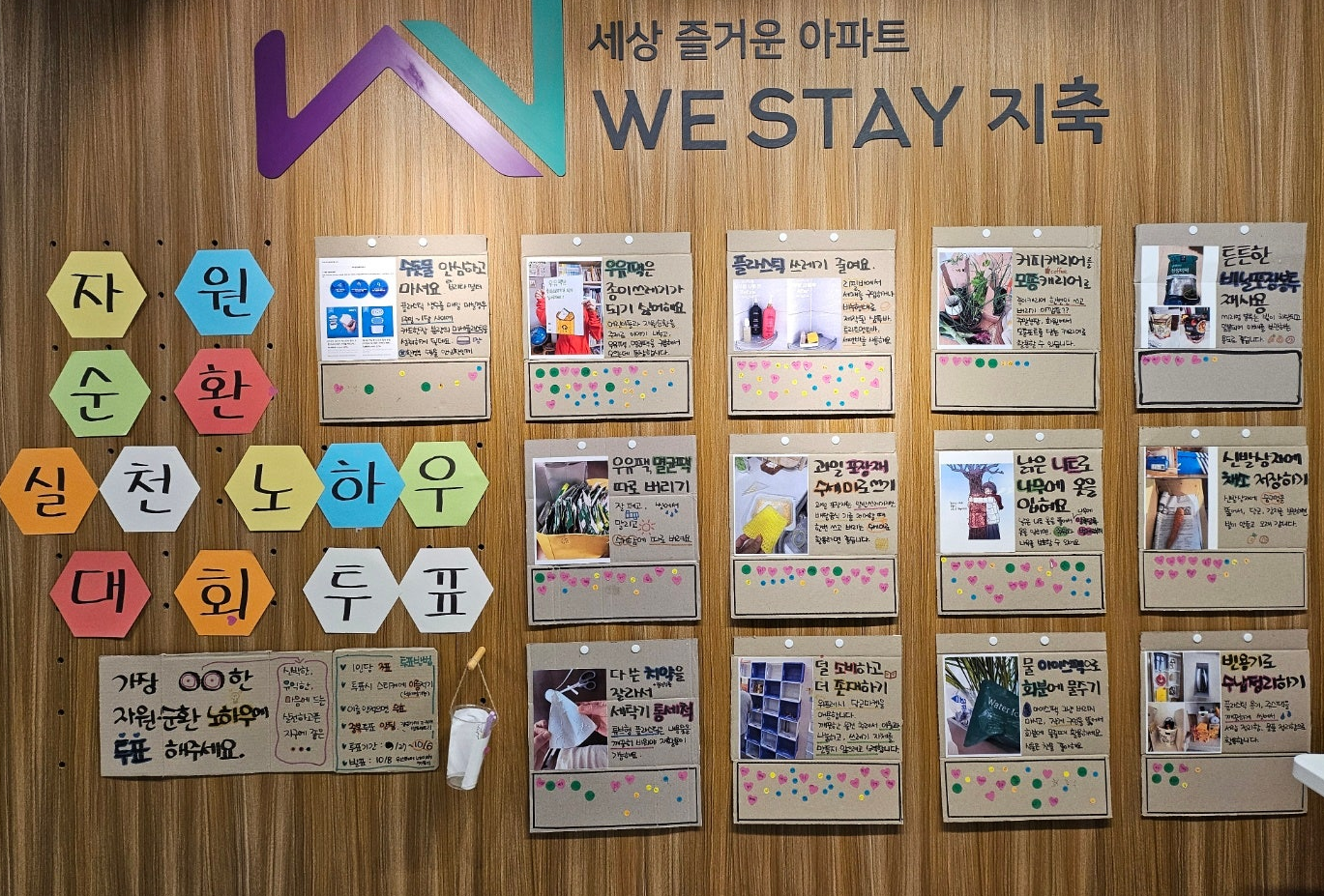 마을 단위에서 자원순환 활동을 시도하는 사례는 다양할 것입니다. 그러나 특별한 금전적 사례 없이 순수한 봉사 정신을 바탕으로 운영하는 자원순환 활동은 때로 지속적인 활동이 어려울 수 있습니다. 위스테이지축 아파트에서는 자원순환에 관심 있는 주민들이 직접 활동을 기획하고 운영하는 방식으로 참여하고 있으며, 마을이 생긴 지 3년이 되는 지금까지 이러한 방식으로 꾸준하게 활동을 지속하고 있다는 점에서 큰 의의가 있습니다.