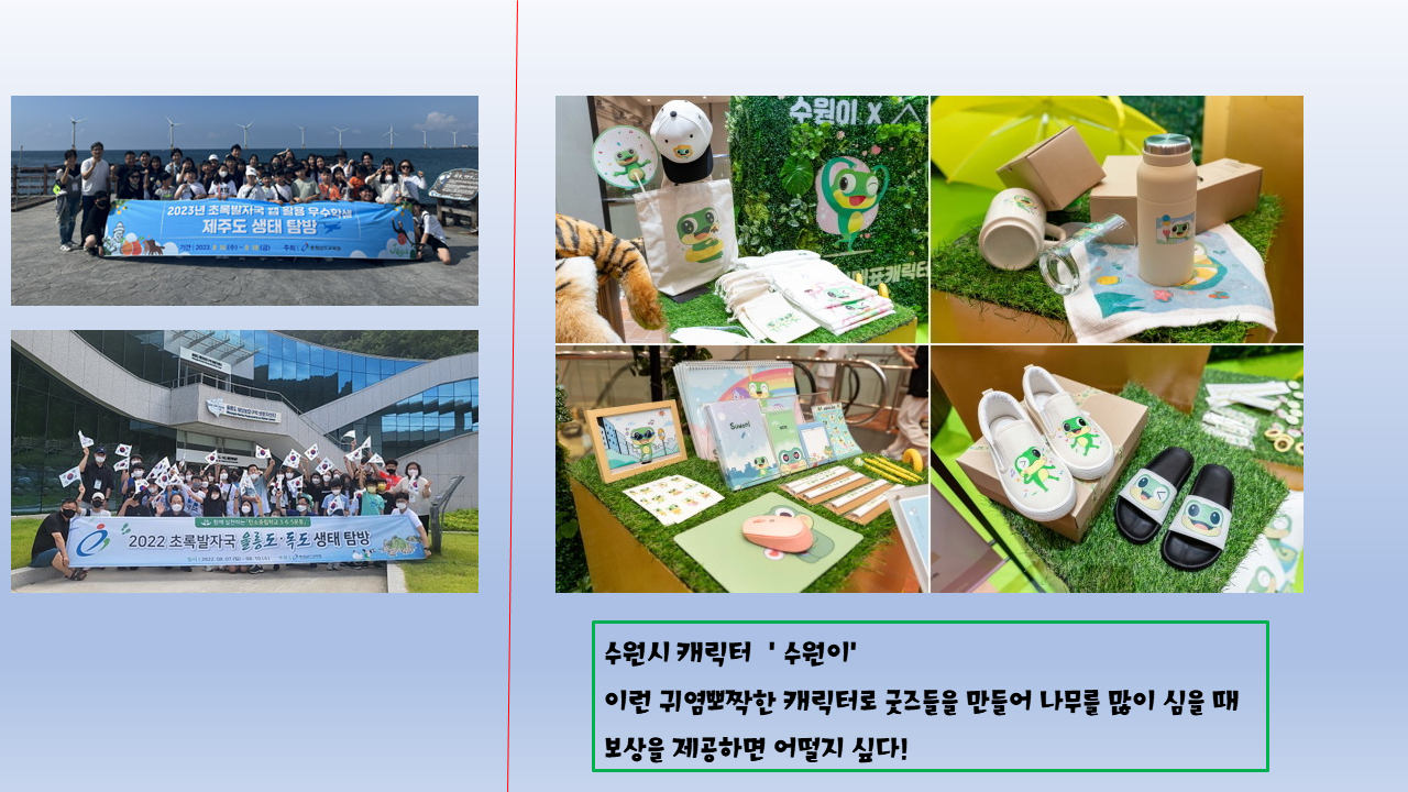 그에 관한 아이디어로 그린웨일 캐릭터를 아이들이 좋아할만한 눈높이로 귀엽게 캐릭터를 만들어 굿즈 등을 개발하여 미션 수행에 따라 지급하는 방식으로 참여자들의 관심을 끌수 있고 우수자원봉사자 워크숍 형태로 그린웨일 나무 분양을 열심히 실천한 도내 청소년들을 대상으로 센터에서 ‘그린웨일 워크숍’ 이라는 학습을 통해 제주도 등 지역탐방과 환경에 대해 더 자세히 배우고 실천할 수 있는 시간을 제공하는 프로그램 참여 기회하여 어드밴티지가 마련되면 어떨지 생각한다.
