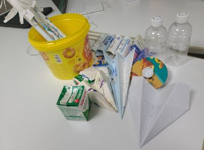 아이들이 직접 마시고 남은 우유팩, 페트병, 재활용이 되지 않는 동화책, 휴지심, 과자박스, 이면지 등을 활용하여