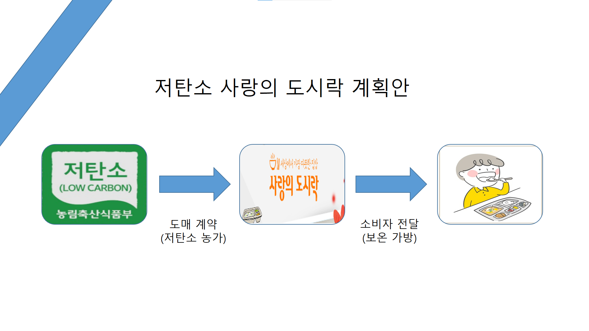 첫 번째로 사랑의 도시락 배달 봉사 단체에서 지역 저탄소 농산물 인증제 참여농가와 직접적으로 계약을 맺어 저탄소 농축산물을 활용하여 도시락을 구성하는 것입니다. 생산과정에서 발생하는 탄소량을 줄이는 동시에 유통·포장 과정에서 생성되는 불필요한 탄소를 최소화할 수 있으며 중간 유통단계를 대폭 감소하였기에 저가의 가격으로 식자재 구매가 가능하며 지역 경제 살리기에도 이바지할 수 있습니다.
