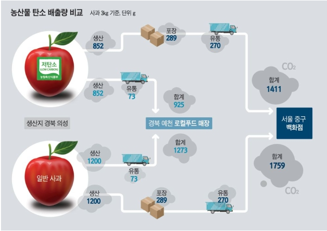 ‘저탄소 농산물’은 ‘저탄소 농업기술 등을 활용하여 생산 전 과정에서 발생하는 온실가스의 배출량이 해당 품목의 평균 온실가스 배출량보다 적은 농축산물’을 말합니다. 농식품부에 따르면 지난해 국내 4952개 저탄소 인증 농가가 총 7만 7769톤(t)의 이산화탄소를 감축했습니다. 사과 농가를 예로 들자면 저탄소 농법을 사용하지 않는 일반 농가의 경우 사과 1㎏을 생산할 때 평균 400g의 탄소를 발생시킵니다. 반면 저탄소 인증을 받은 농가는 같은 양을 생산할 때 약 284g의 탄소를 발생시킵니다. 3㎏짜리 사과 한 박스를 기준으로 보면 일반 사과는 생산 과정에서 1200g의 탄소를, 저탄소 사과는 852g의 탄소를 발생시키기에 상당한 탄소 생성량 저감효과를 보입니다.