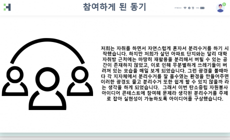 저희는 자취를 하면서 자연스럽게 혼자서 분리수거를 하기 시작했습니다. 하지만 저희가 살던 아파트 단지와는 달리 대학 자취방 근처에는 마땅히 재활용을 분리해서 버릴 수 있는 공간이 존재하지 않았고, 이로 인해 무분별하게 쓰레기들이 버려져있는 모습을 매일 보게 되었습니다. 그런 광경을 볼때마다 각 지자체에서 분리수거를 잘 할수있는 환경을 만들어주면 이러한 광경도 줄고 분리수거 또한 쉽게 할 수 있지 않을까라는 생각을 하게 되었습니다. 그래서 이번 탄소중립 자원봉사 아이디어 콘테스트에 참여해 문제라 생각된 분리수거를 주제로 잡아 실현성이 가능하도록 아이디어를 구상했습니다.