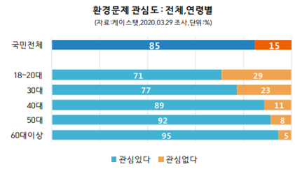 한편 기성 세대 사이에서도 기후 위기에 대한 관심도는 높다. 특히 2020년 여론조사기관 케이스팟에 따르면 연령대가 높을수록 환경 문제에 대한 관심도도 높게 나타났다. 국민 1,014명 중 환경 문제에 ‘관심이 있다’고 응답한 18~20대의 비율은 71%, 20대의 비율은 77%였고, ‘60대 이상’의 비율은 95%로 가장 높았다.