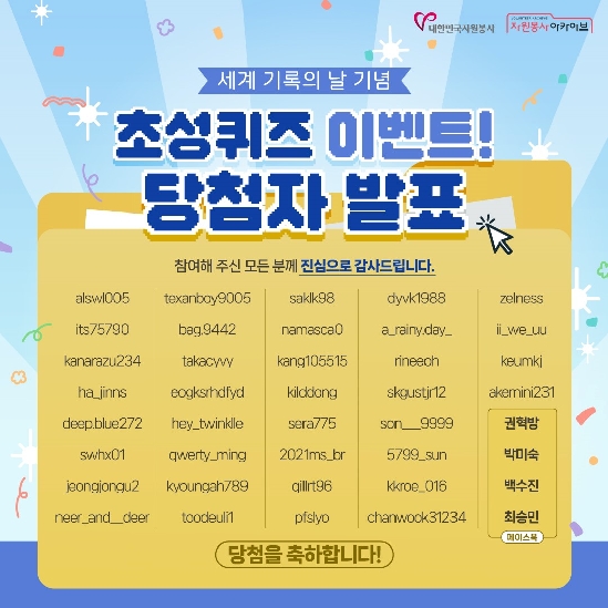 710 자원봉사 아카이브 초성퀴즈 이벤트 당첨자 발표 2023.06.27
