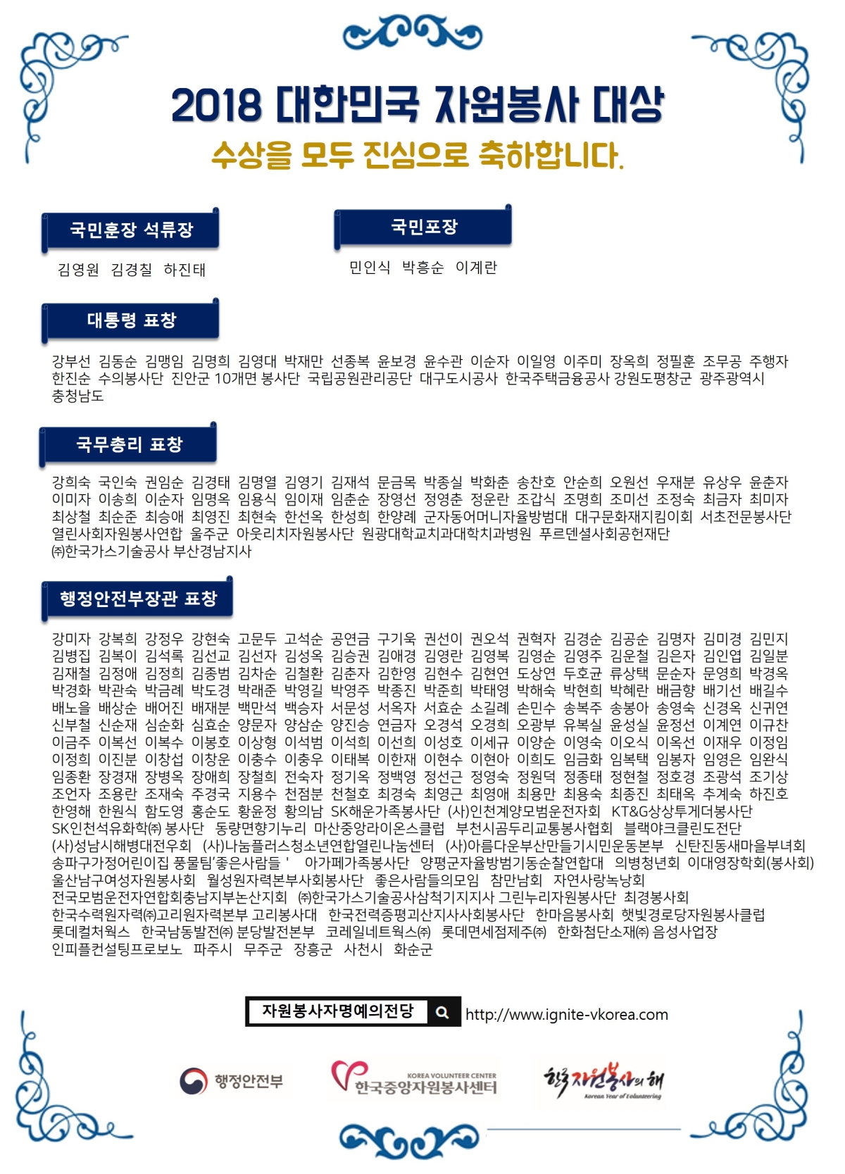 수상자 2018년 대한민국 자원봉사 대상 수상자 명단 2021.06.30 관리자 ? 2018 대한민국자원봉사대상 사례집.pdf 이전글 2019년 대한민국 자원봉사대상 수상자 명단 목록 다음글 2017년 대한민국 자원봉사 대상 수상자 명단